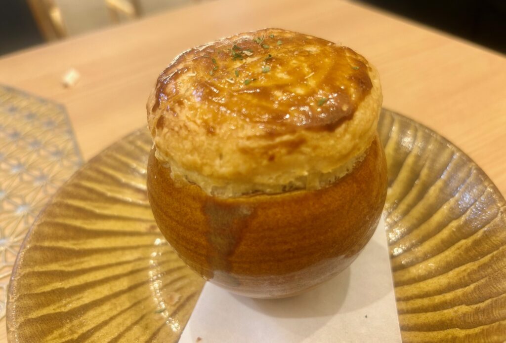 2品目はパイ包み焼き仕様のカレースープ、とろとろに炊き込まれた薄めのスープが入る。どの料理もマダムがお腹の具合を聞きながら量を調整していただける。