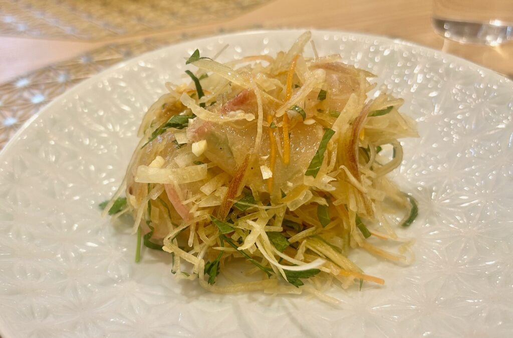 3品目は中華風のお刺身。香味野菜と鯛が豪快に盛り付けられてこちらに中華醤油をかけて混ぜ合わせる。ずっと昔に「海皇」という高級海鮮中華料理屋さんでいただいた記憶がある。