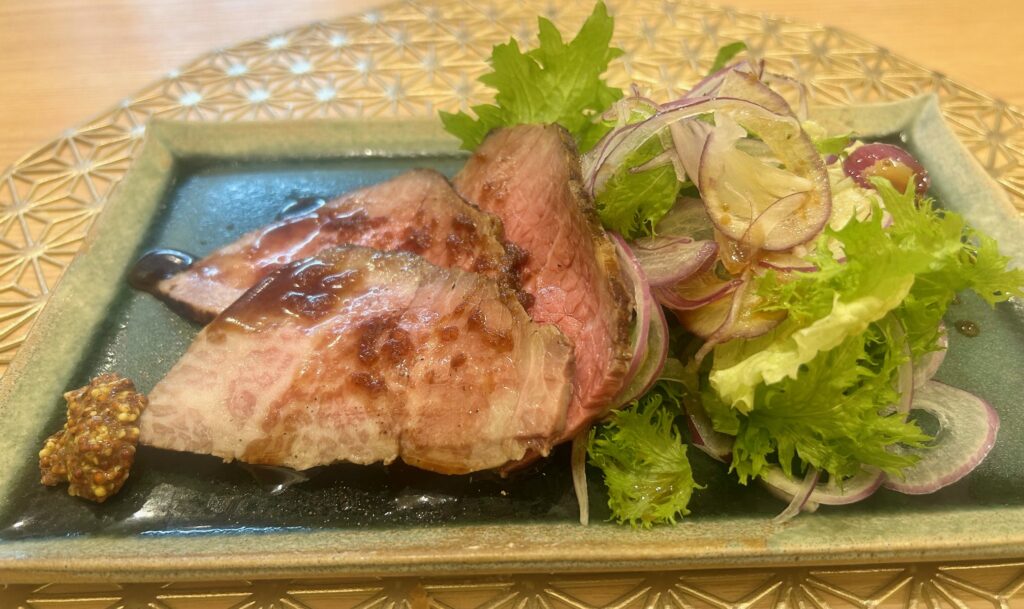 続いてこちらの店のスペシャリティーローストビーフ。厚めにカットされていて食べ応えも満点。肉は熟成されていて茶豆の香りがする。味わいも濃厚で肉の味がしっかり感じる逸品。