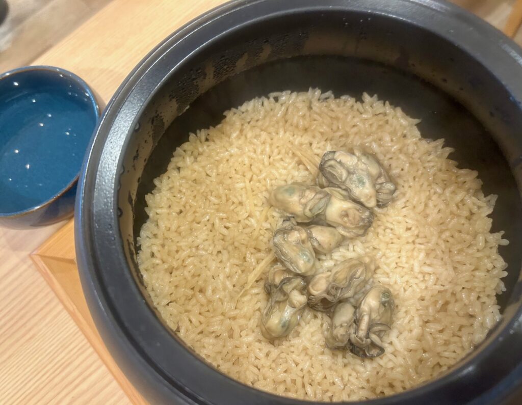 土鍋で炊き込んだ牡蠣ご飯。牡蠣は坂越のブランド牡蠣の侍オイスターを使用。