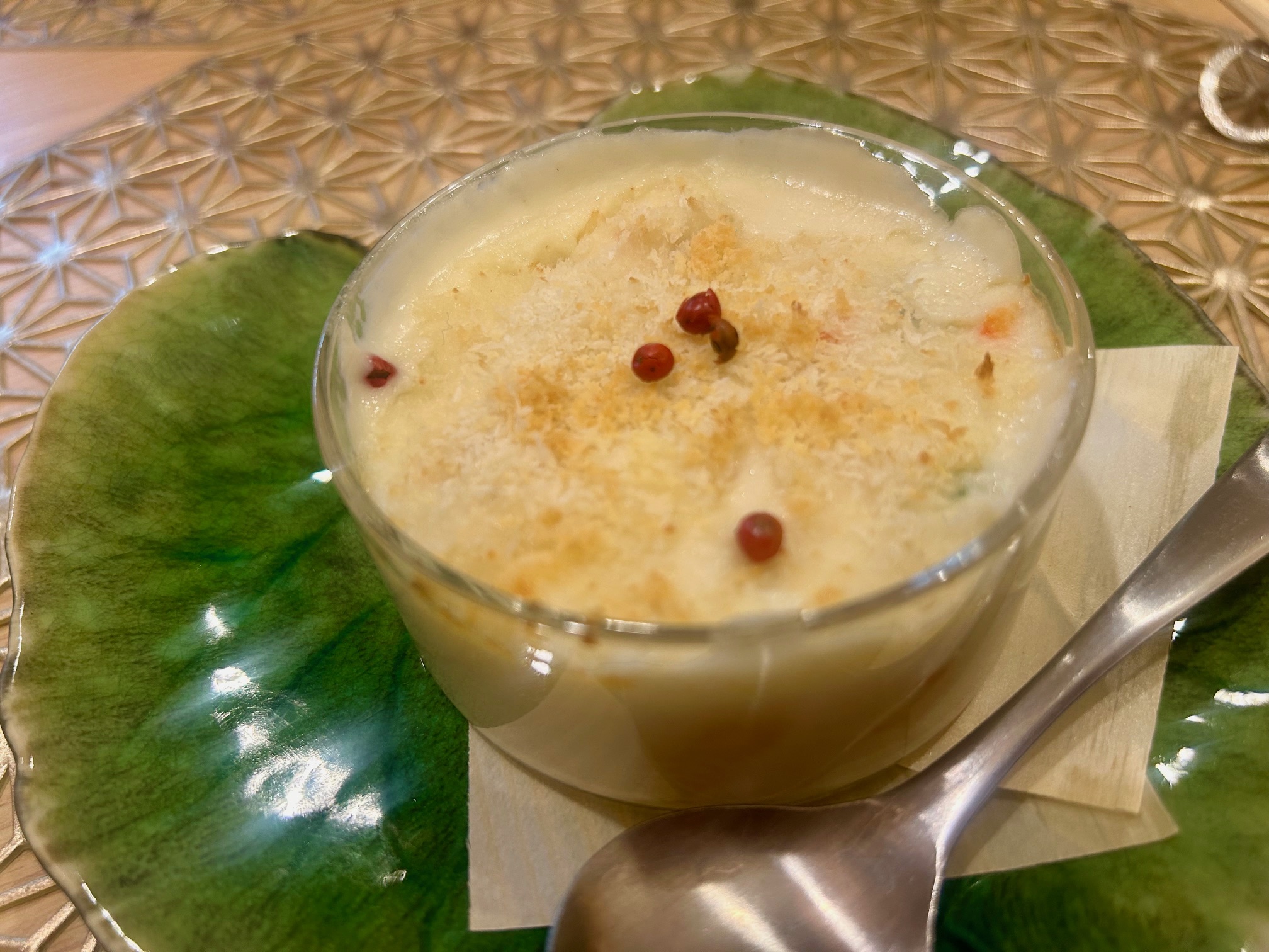 ガラスの器に入った蟹グラタン。優しい口当たりでとても美味しい。