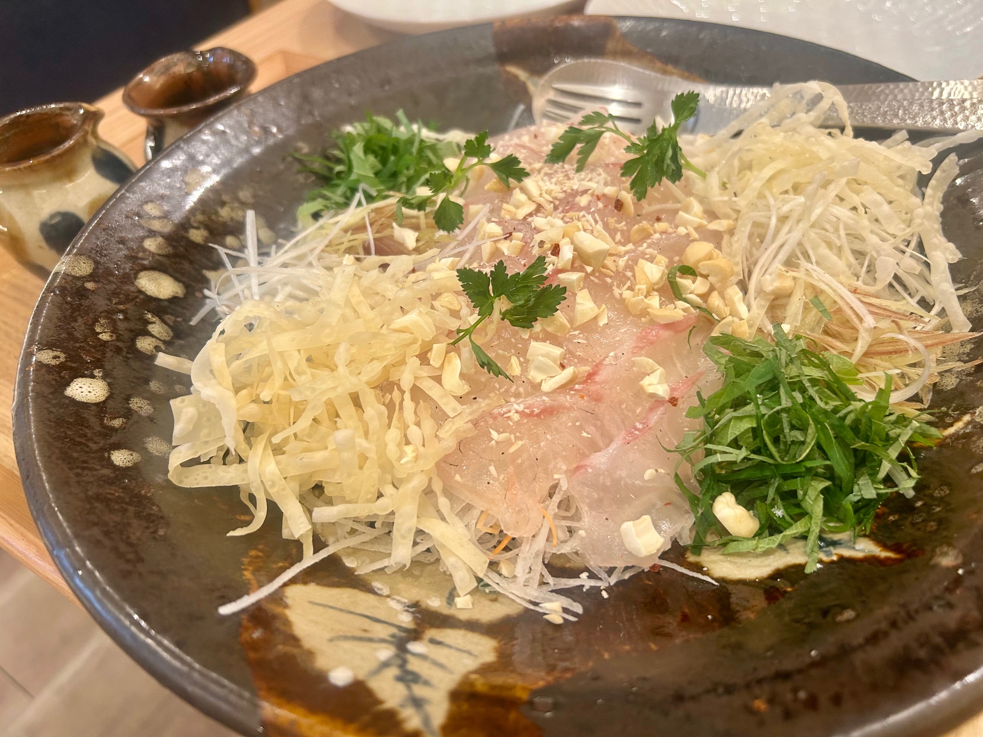 3品目は中華風のお刺身。香味野菜と鯛が豪快に盛り付けられてこちらに中華醤油をかけて混ぜ合わせる。ずっと昔に「海皇」という高級海鮮中華料理屋さんでいただいた記憶がある。