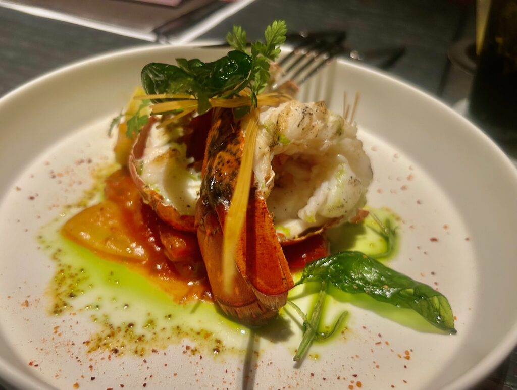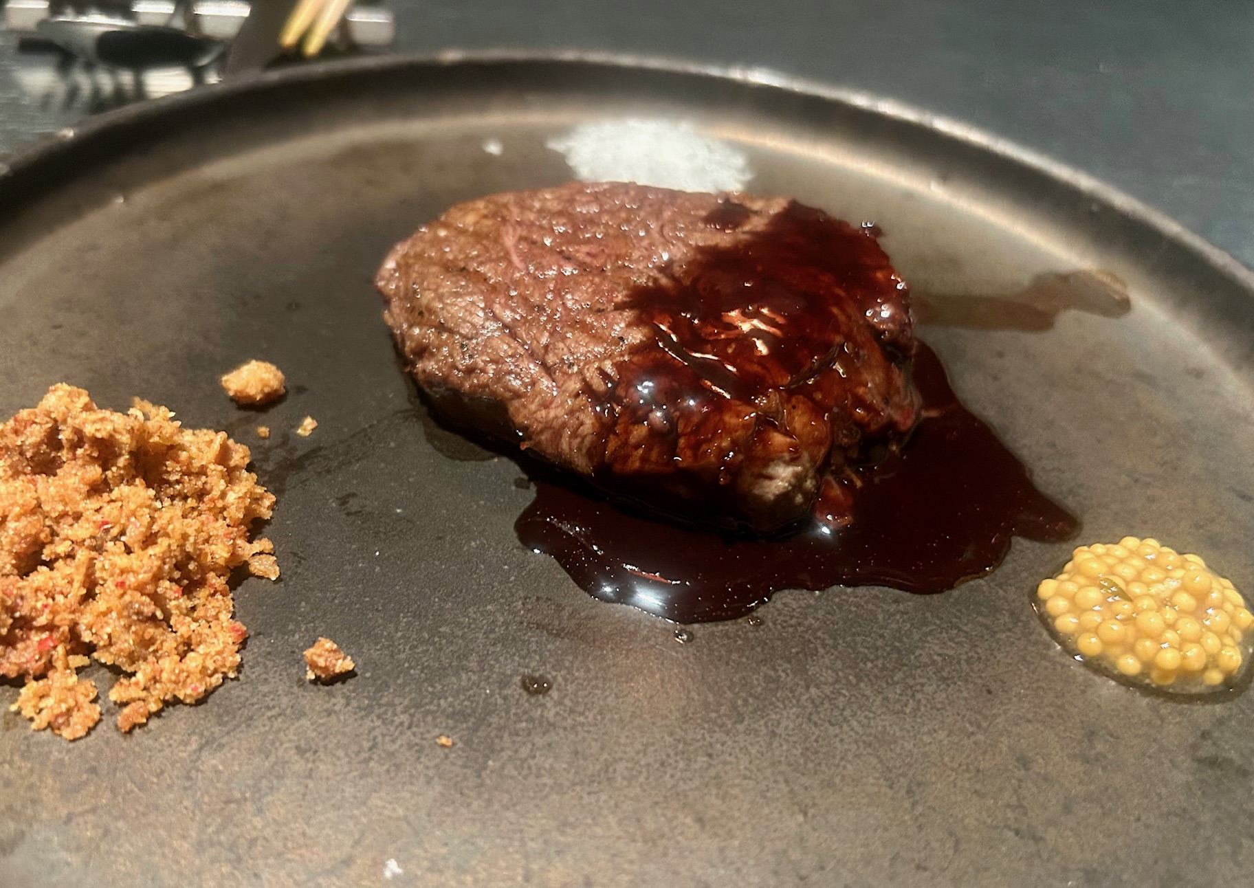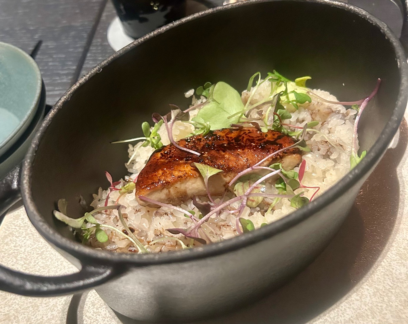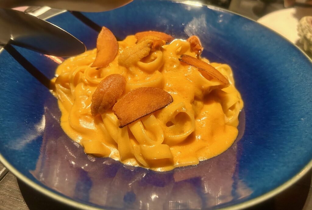 しばらくして着丼。丼一面に敷かれたチャーシューが特徴的。スープはラーメンの味わい。国産豚とホタテ出汁とのこと。少し化学的な味がする・・・