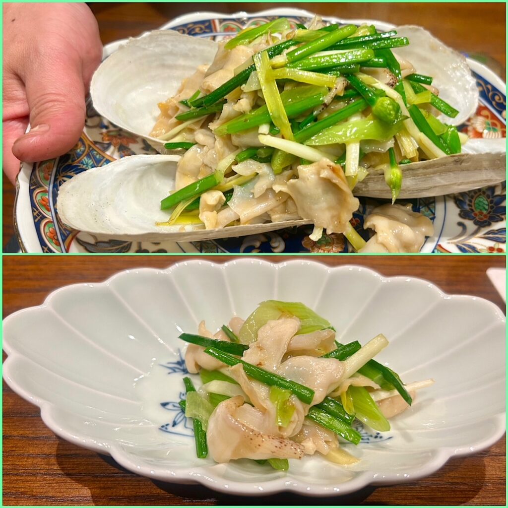 白ミル貝と黄韮の炒め物。最初に大皿でプレゼンテーション。その後、銘々皿に取り分けいただく。ミル貝の旨みはもとより黄韮の食感と香りがとてもいい。