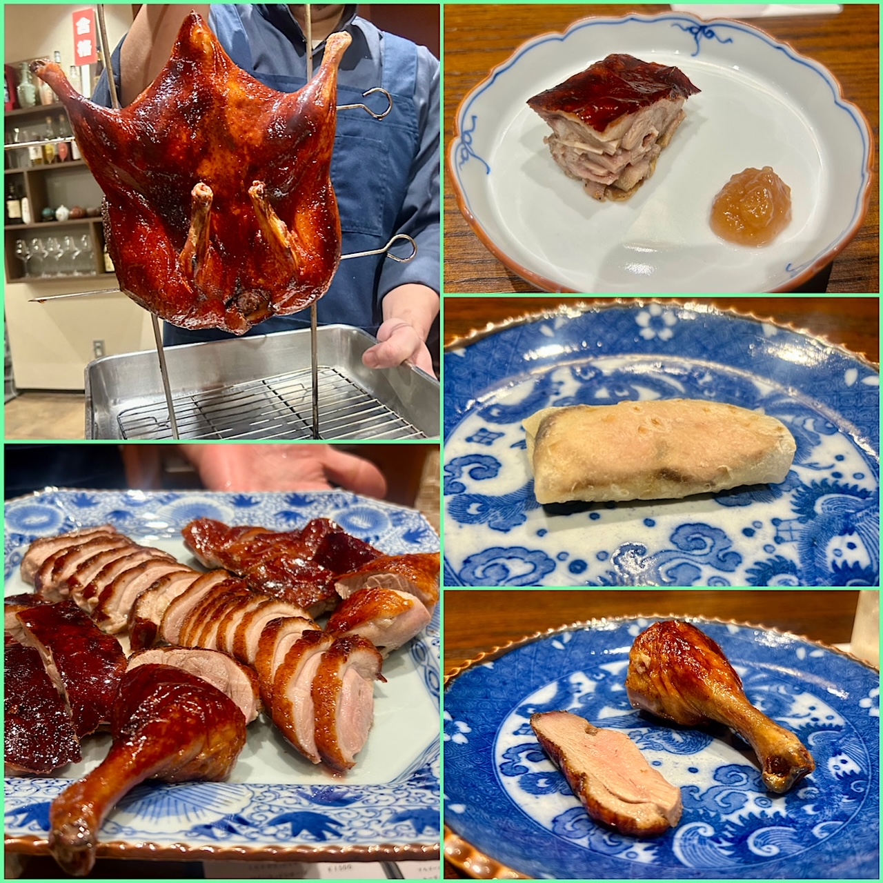 スペシャリティの北京ダックは広東スタイルで供される。事前に軽く火入れされたアヒルが厨房に吊るされている。広東式なので背中が開かれた状態で調理される。これを何度も高温の油を掛けていい色に仕上げる。この光景と油の音も食欲を唆るご馳走。