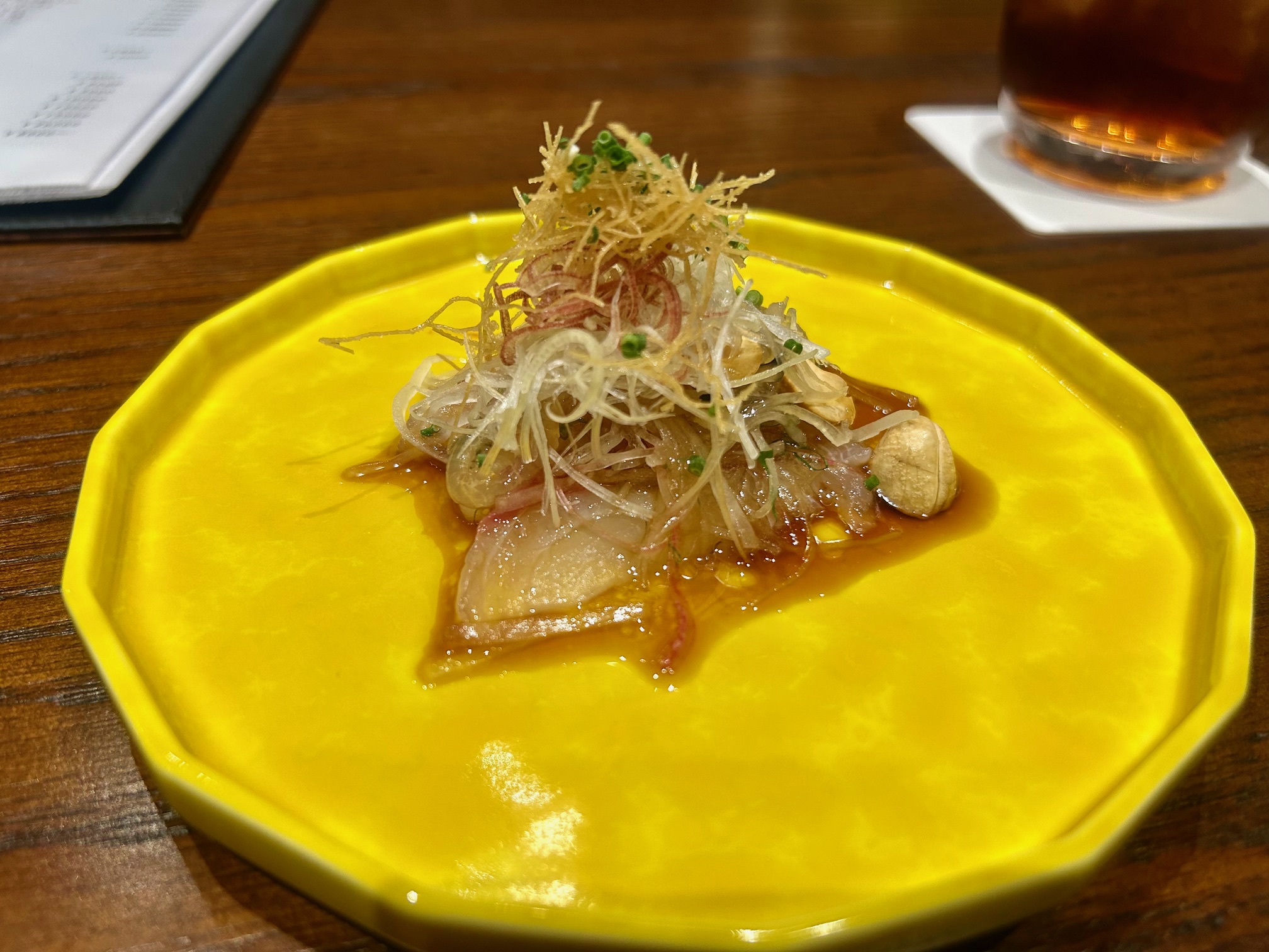 続いて和歌山産天然鯛の中華風刺身。広東料理の定番。ナッツや揚げた野菜など異なった食感のあしらえが添えられる。10年紹興酒のロックと一緒にいただく。