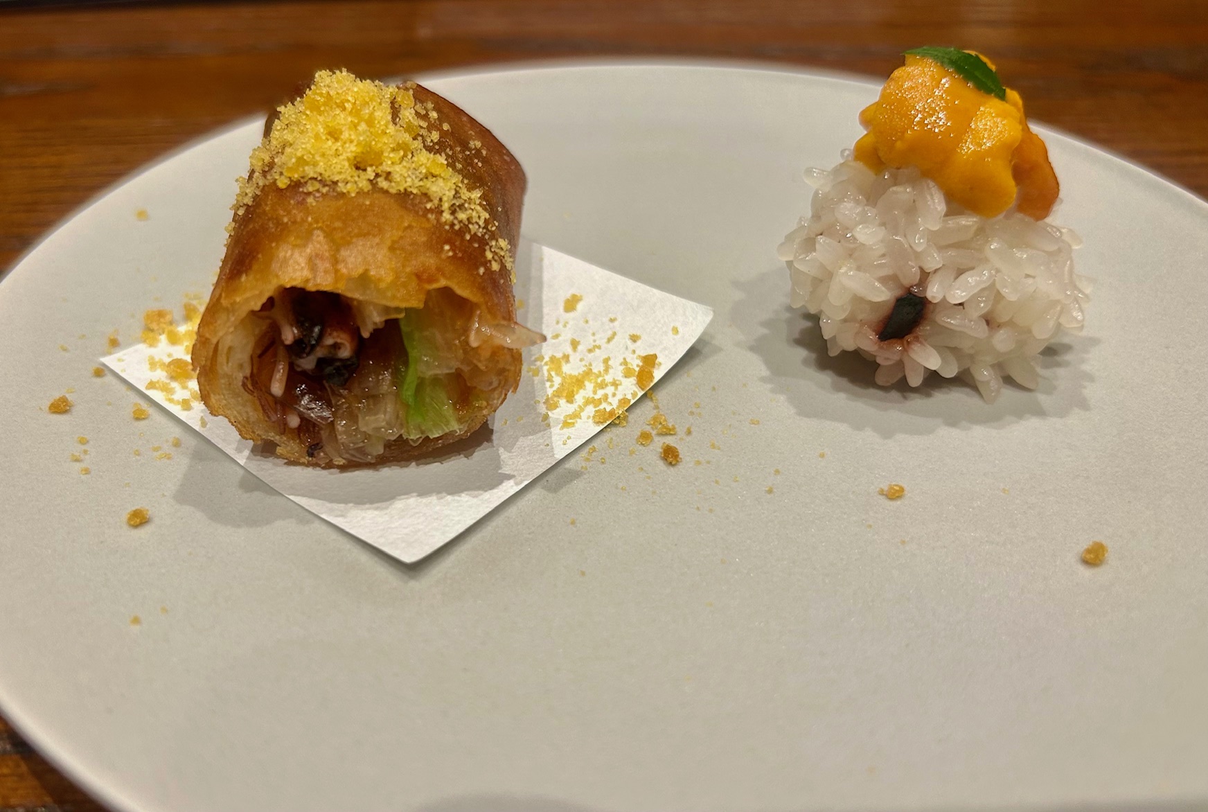 ホタルイカと春雨、九条ネギ、小エビペーストが入った春巻きとモンゴイカ真薯と北海道雲丹。春巻きはホタルイカとエビのペーストの相性が抜群にいい。イカ団子も安定の美味しさ。
