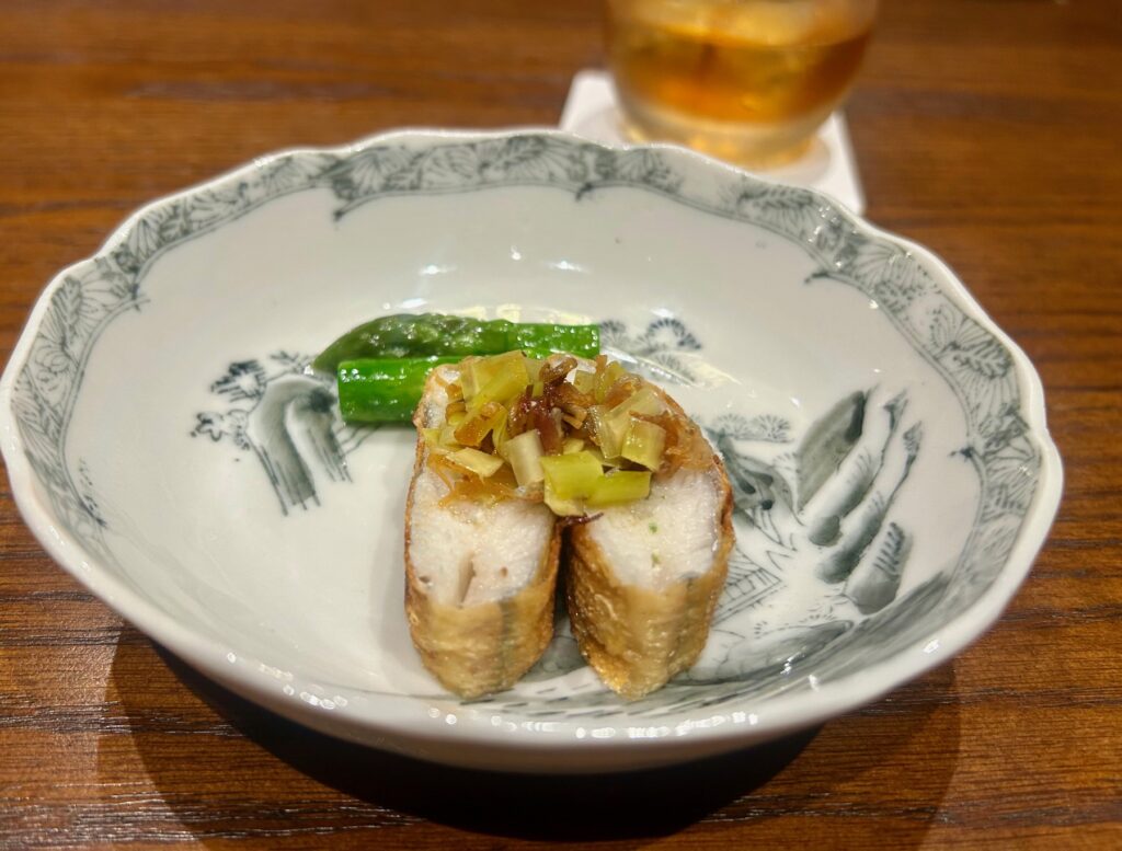 突き出しは刻んだ玉ねぎを炒めてミキサーにかけて裏漉しをして、牛乳と合わせ、葛を入れて練り込む「玉ねぎ豆腐」からスタート。豆腐のようだけど玉ねぎ感が強くて甘くてとてもおいしい。