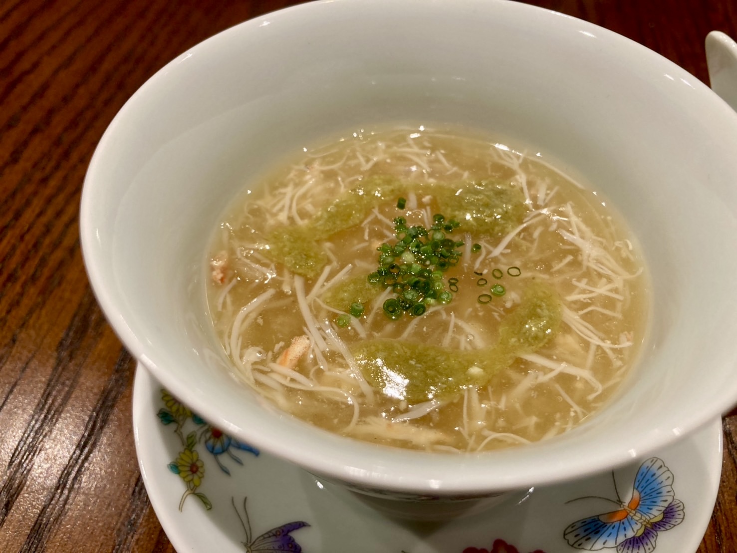 蟹とフカヒレのスープも上湯の透き通った味わいが日本料理の煮物椀のよう。