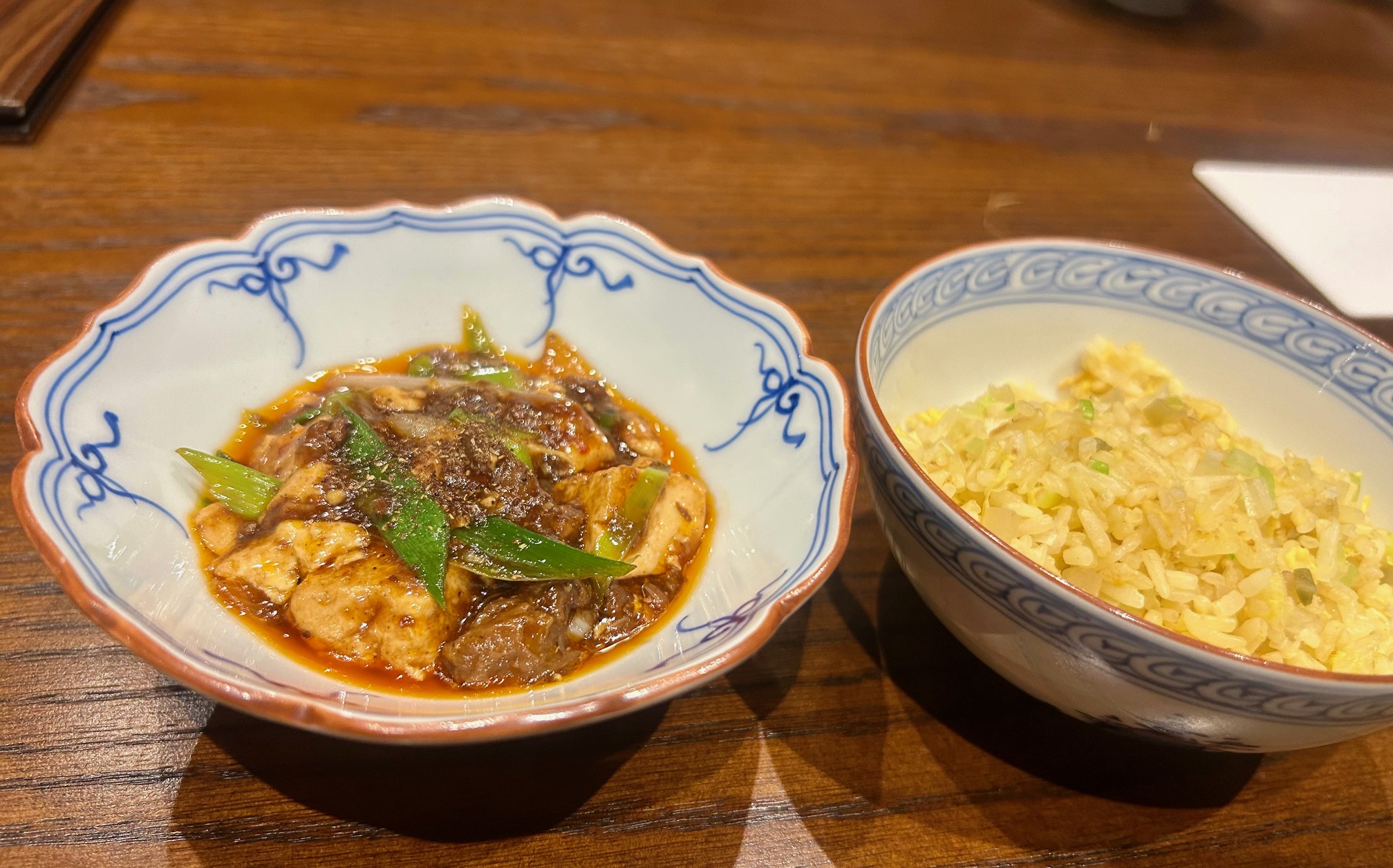 食事は炒飯と麻婆豆腐が供される。麻婆豆腐も長粒米を使った薄味の炒飯も大量に作ってプレゼンテーションされてから銘々に盛り付けされる。炒飯に麻婆豆腐をかけてスプーンでいただく。。辛味は強くなくて、ひき肉のコクと旨味、野菜の甘み、麻辣スパイスがいい塩梅。