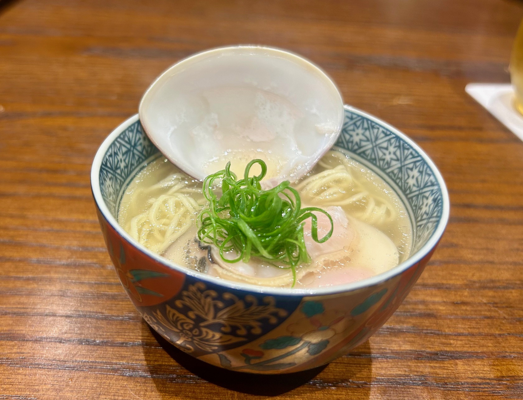 蛤ラーメンは一口サイズ。旬の蛤の火入れも完璧。スープにいいエキスが出てとても美味しい。