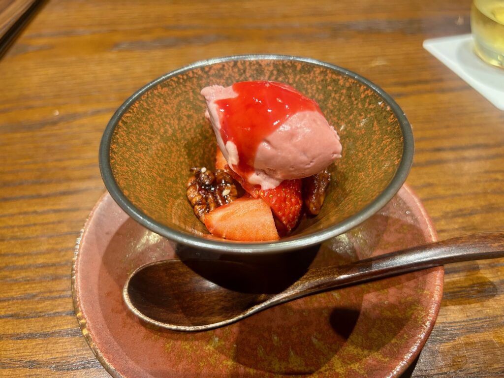 デザートはピーカンナッツと苺とフランボワーズのアイス。ライチ紅茶と共に供される。