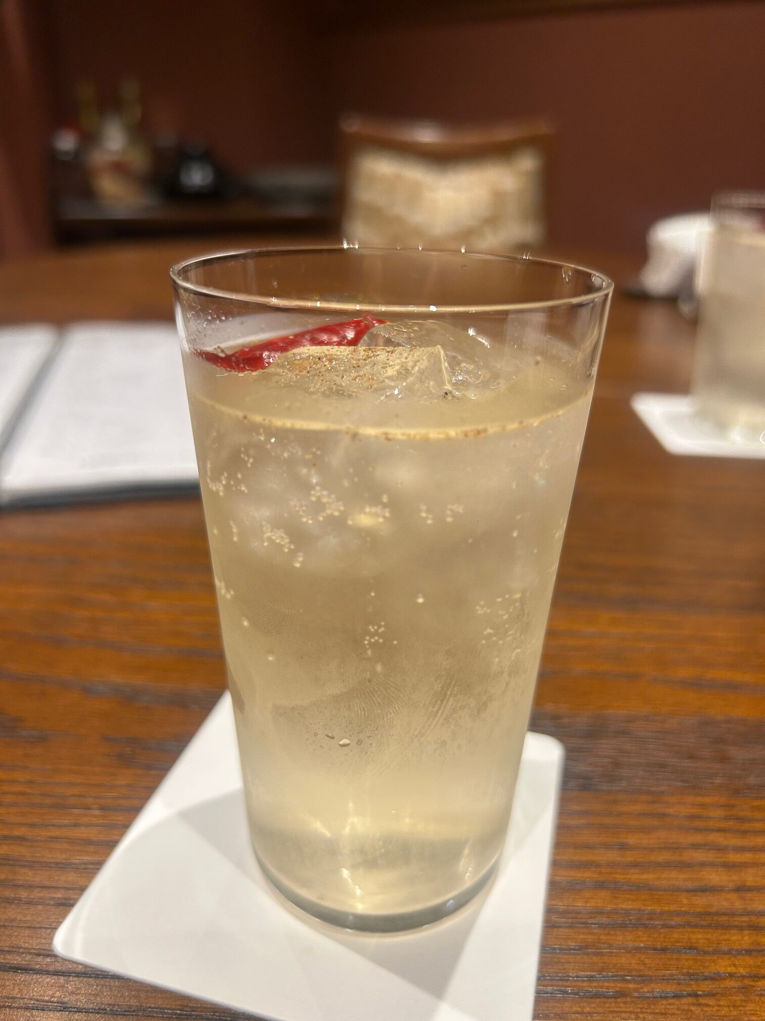 オリジナルの麻辣白酒ハイボールは白酒ベースに唐辛子と山椒でスパイシー感を出したもの。前回このお店で初めていただきました