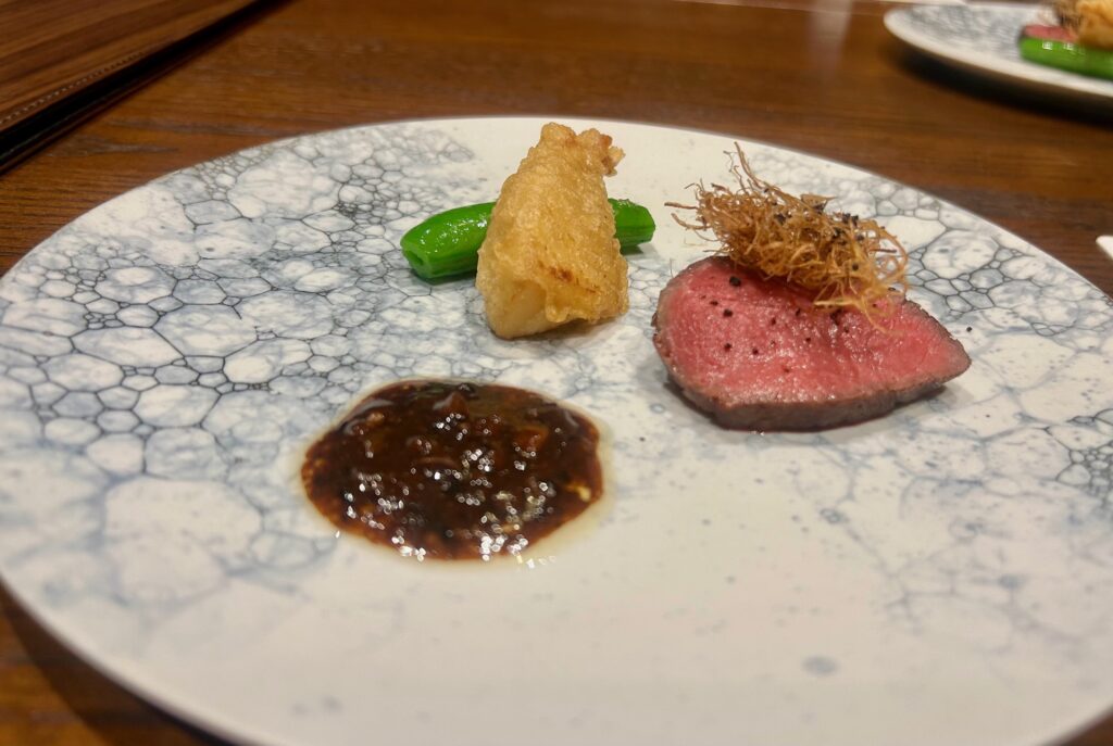 肉料理は和牛ラムシンの低温火入れしたものでとても柔らかで味も深い。お馴染みの豆豉ソースでいただく。貝塚の筍のフリットとスナップエンドウが添えられる。