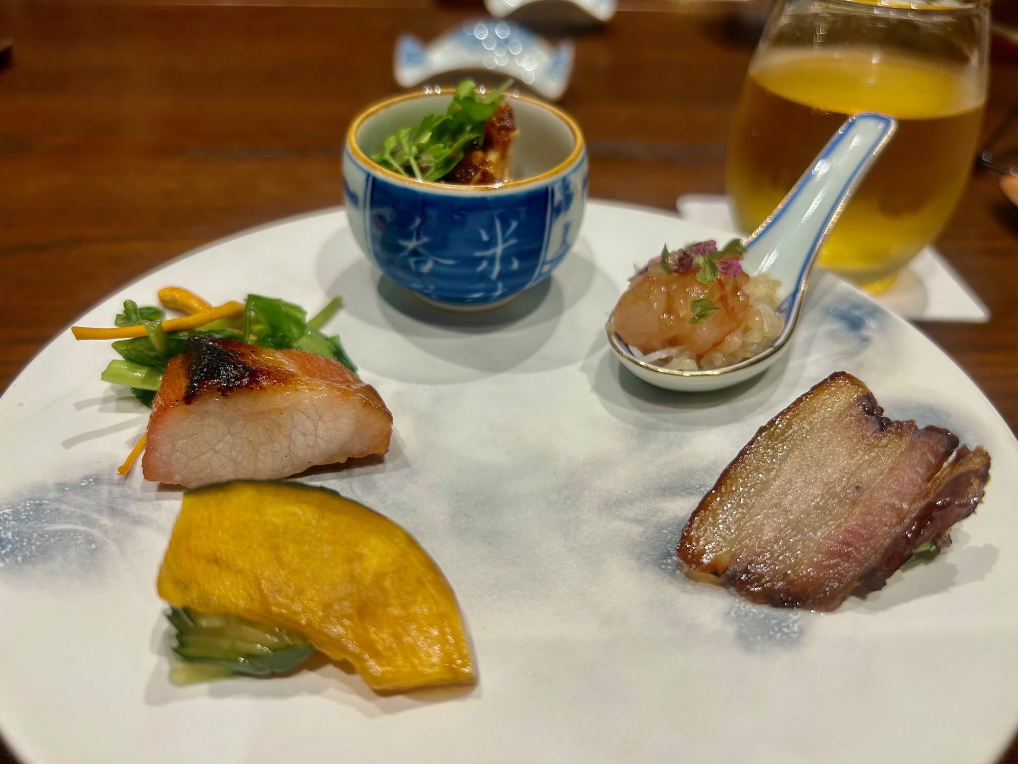 前菜は5種盛り合わせ。揚げた鈴カボチャと胡瓜の酢の物、自家製干し肉と上湯で湯掻いた一寸豆、北海道産甘海老の紹興酒漬けとクラゲ、よだれ鶏、焼きたて焼豚とクレソンと夏草花茸など。どれも手間のかかった細やかで丁寧な仕事。