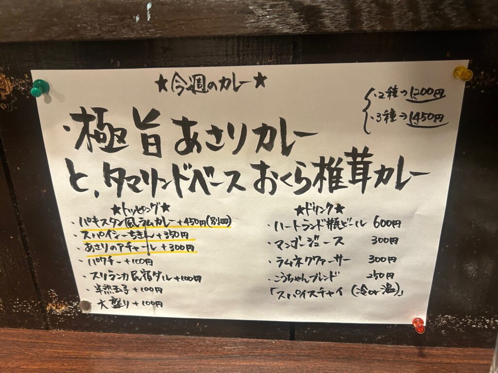 メニューは週替わりであいがけ一種類のみ(トッピングによるアレンジは可能)この日は極旨あさりカレーとタマリンドベースオクラ椎茸カレー1200円を所望する。