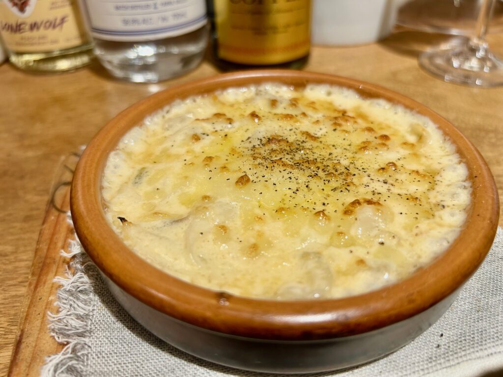 近藤さんの玉ねぎグラタン750円はトロピカルな白ワインと合わせていただく。玉ねぎの食感と甘さが懐かしさを感じさせる。