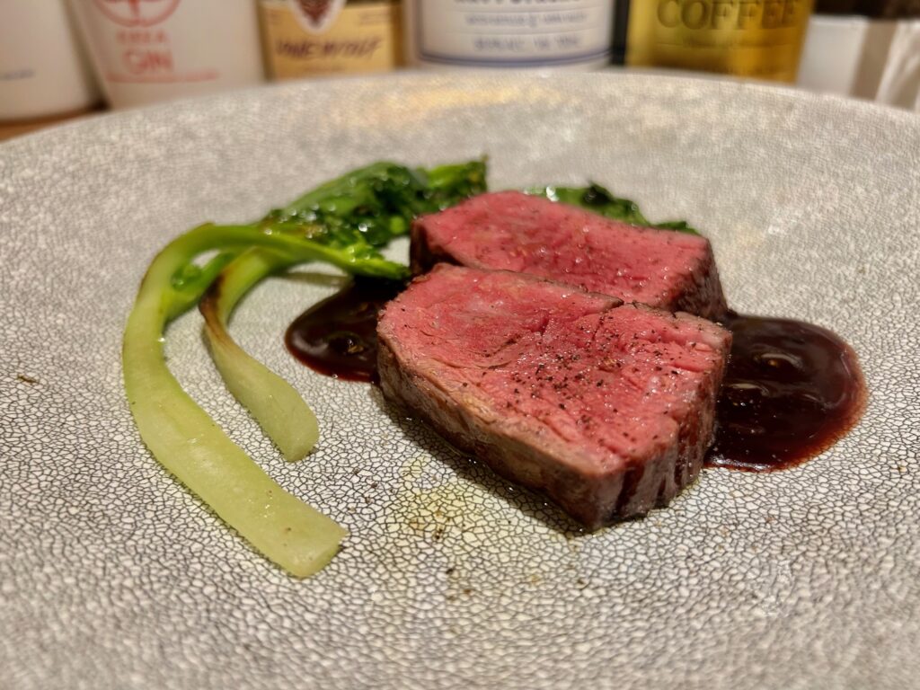 住之江区粉浜商店街の精肉店「うしや」の熊本赤牛カイノミステーキ3600円 赤ワインと山葵のソース スティックブロッコリー。パサつきは全くなくて火入れの妙を感じさせる。ソースもさっぱりしていてポルトガルの赤ワインと合わせていただく。