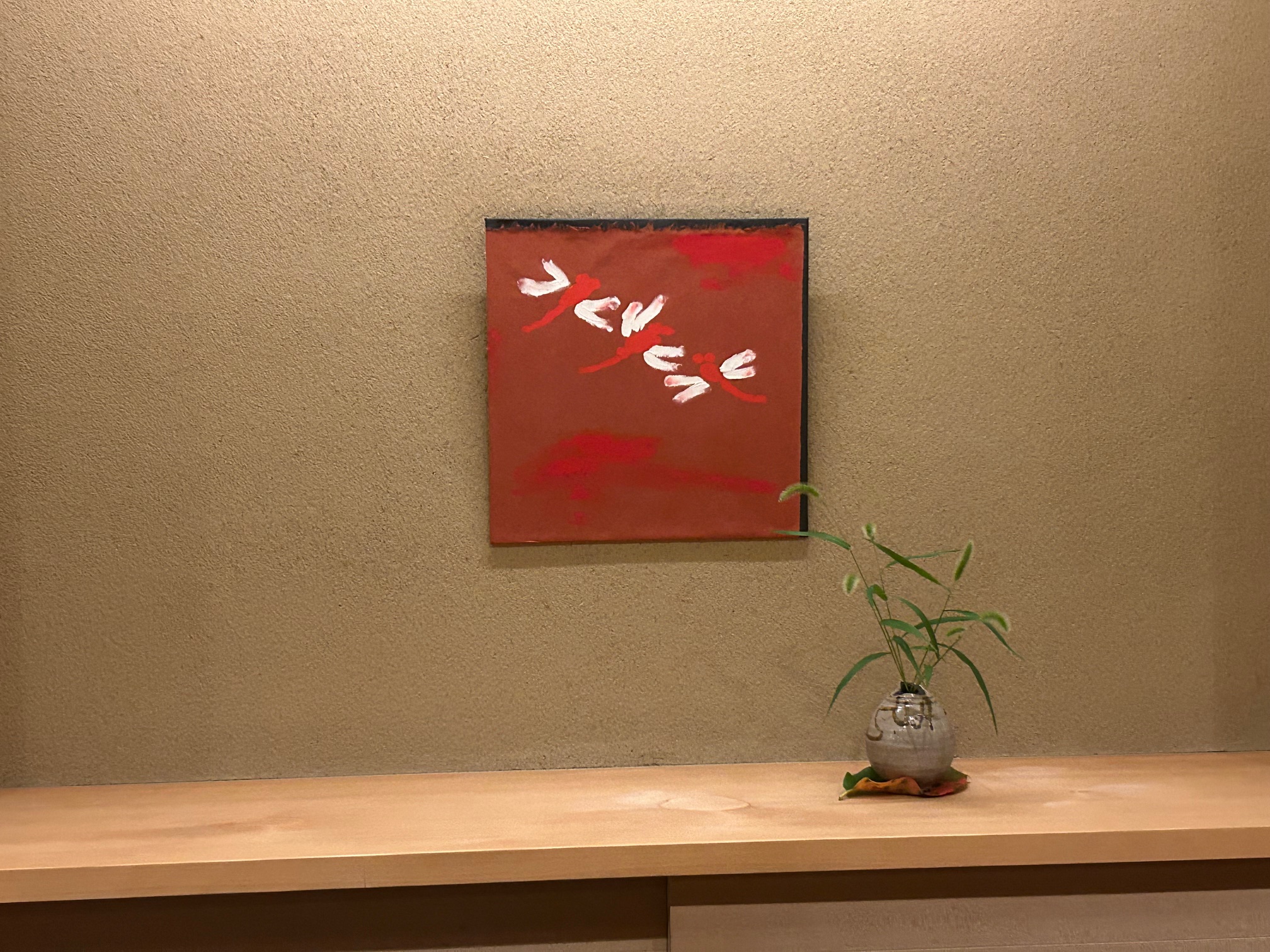 食事のスタートは14時と17時半の2部制。コース料理は使用される食材で変動する。この日の料理は35000円(税サ別で42350円)で少しお高め。8席のカウンターで17時半から相伴させていただく。