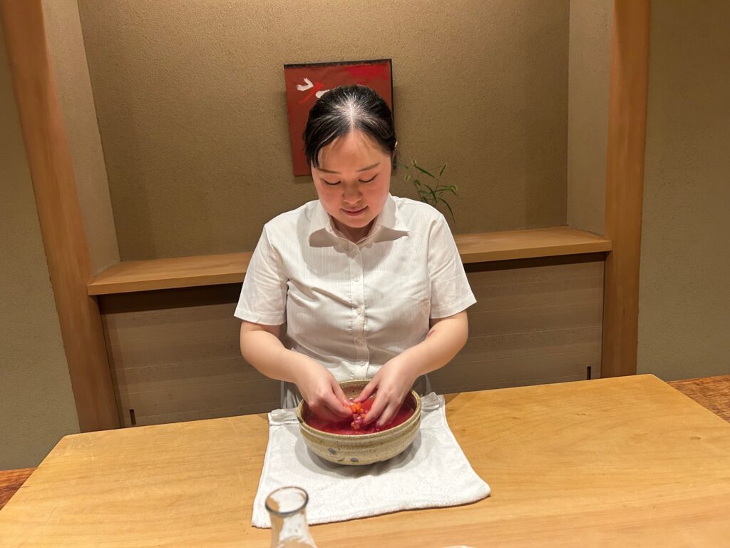 筋子をお湯で掃除をしていくらを作る作業をカウンターでされるお弟子さん。