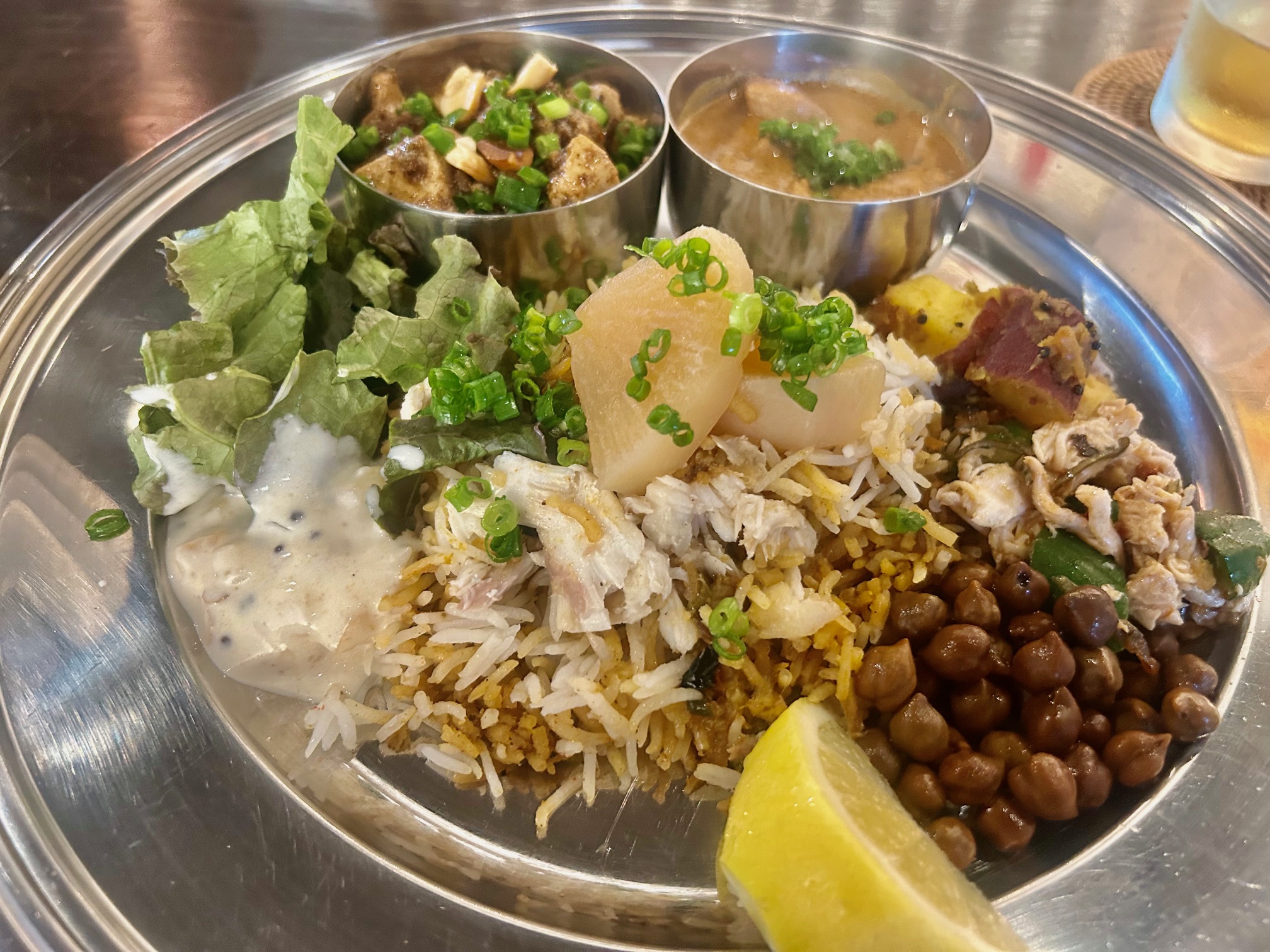 副菜の大根も鯛の味がして和食の煮物のようなテイスト、そのほかにかぼちゃのチャダルの和マサラ炒め、ささみ胡瓜のスパイス塩昆布和え、黒雛豆、柿のライタ(ヨーグルトのようなもの)などの副菜が添えられる。