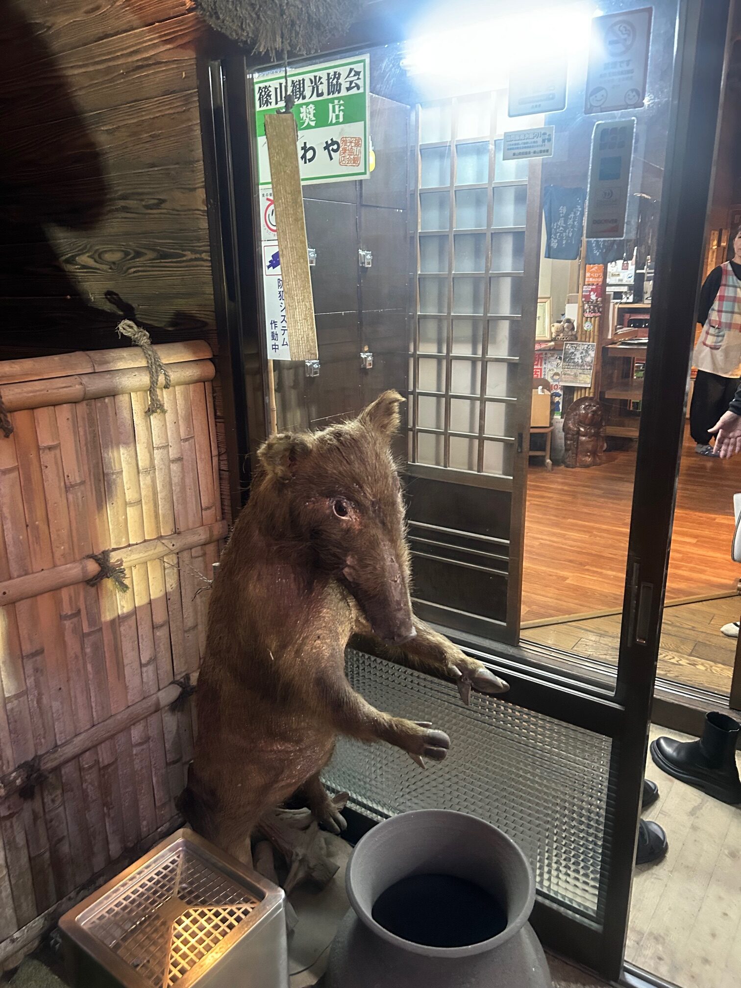 店の入口には大きな猪の剥製が鎮座。店内にもいくつかの猪の剥製が飾られる。板張りで床暖房の入ったの大広間は大小の囲炉裏が点在し囲炉裏を囲んで食事をするスタイル。
