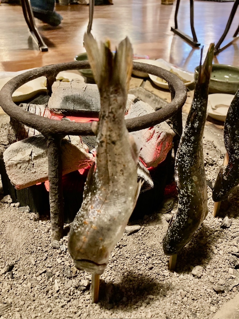サイドメニューのアマゴ塩焼き800円を所望する。串刺しにされたピクピクと動くアマゴを囲炉裏で焼き上げる。片面25分ずつじっくり炭火で焼き上げると骨までいただけるとのこと。