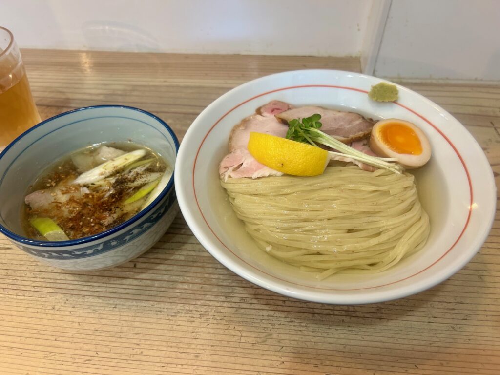 麺の上の具材は肩ロースチャーシューと焼き込んだバラ肉チャーシュ、淡めの煮卵、貝割れとレモン、柚子胡椒が添えられる。豚バラ肉とネギが入った油分が多めの温かいつけだれは和風の出汁感が強め。
