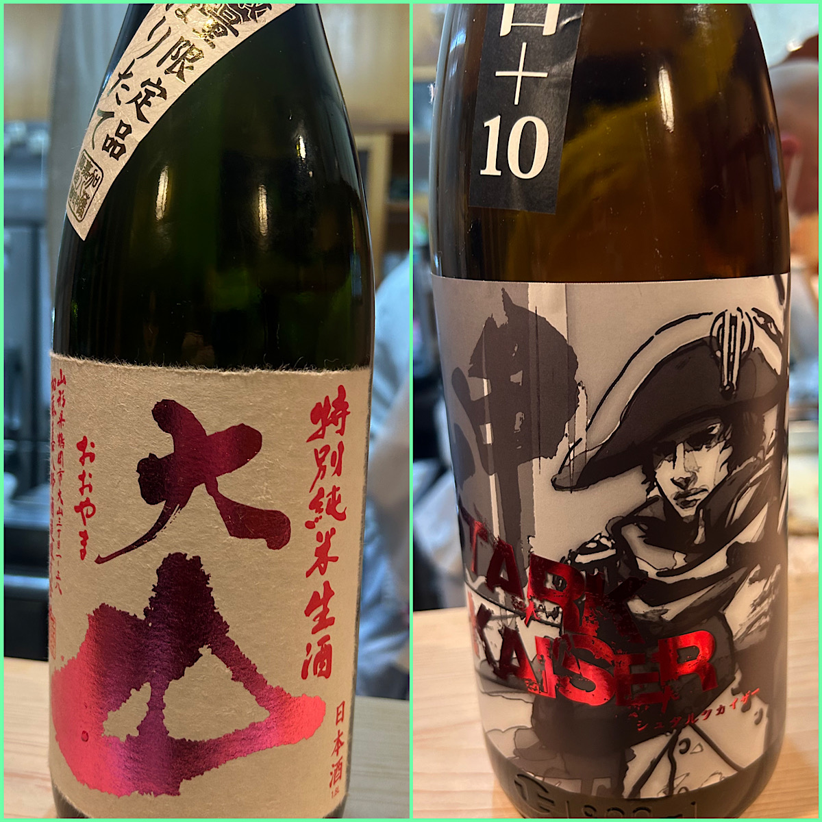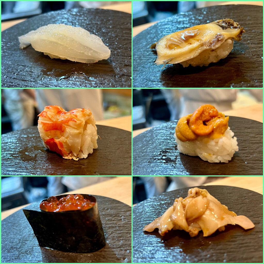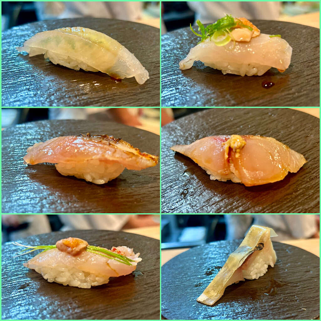 寿司の扉は鱚昆布締めから。中に木の芽が鋳込まれる。年中同じ内容だけど毎回美味しさの記憶が蘇る。コリコリのカワハギには肝とネギが添えられる。寿司のサイズは極小でとても食べやすい。皮目を炙ったカマスは脂の焦げた香ばしさが秀逸。かなり新鮮な生サバの漬けにはマスタードが添えられる。肝と芽ねぎが添えられた北海道のキンキ。肝独特のフォルムの締め鰺も大好物。これらを日本酒と共に楽しむ。。
