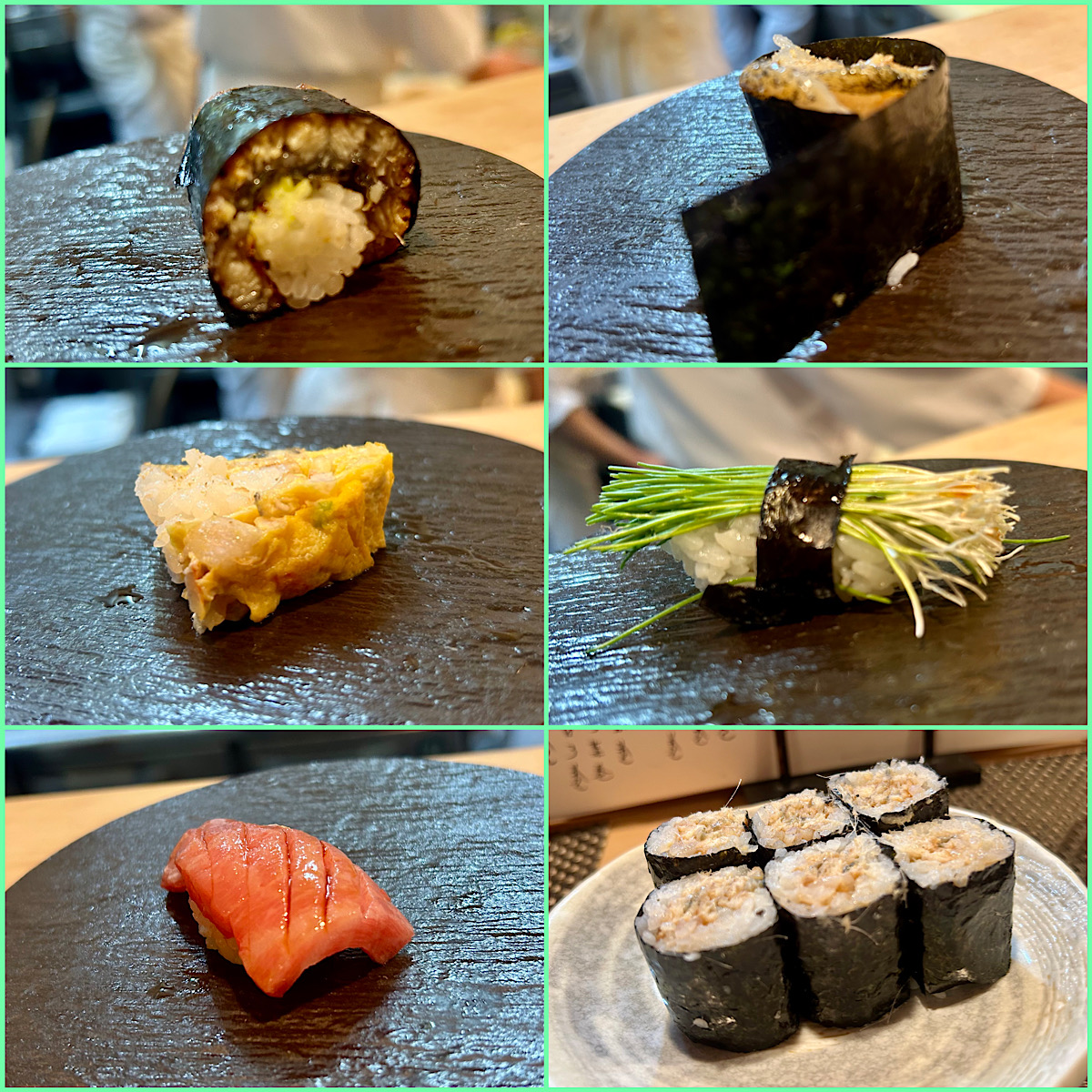 熱々の鰻の海苔巻きもこの店ならではの美味しさ。つぶ貝にはアクセントに胡椒がかけられる。海老や野菜がたくさん入る出汁感たっぷりの帛紗卵焼きでコースは終了。追加で芽ねぎをいただく。娘は中トロで大満足。穴子きゅうり巻きでフィニッシュ。