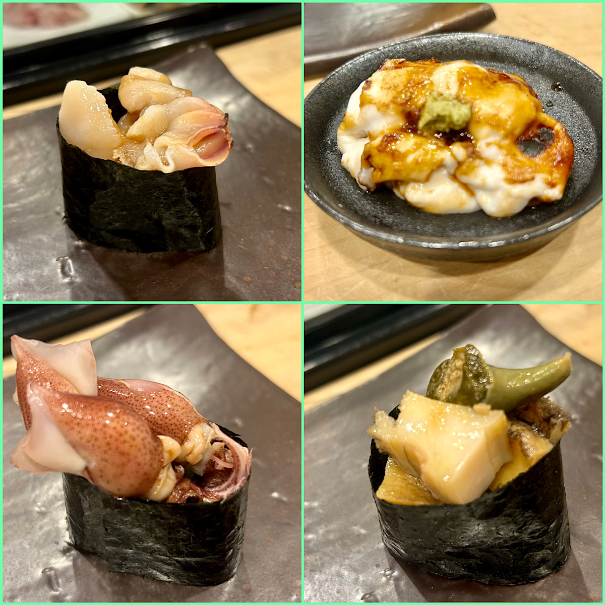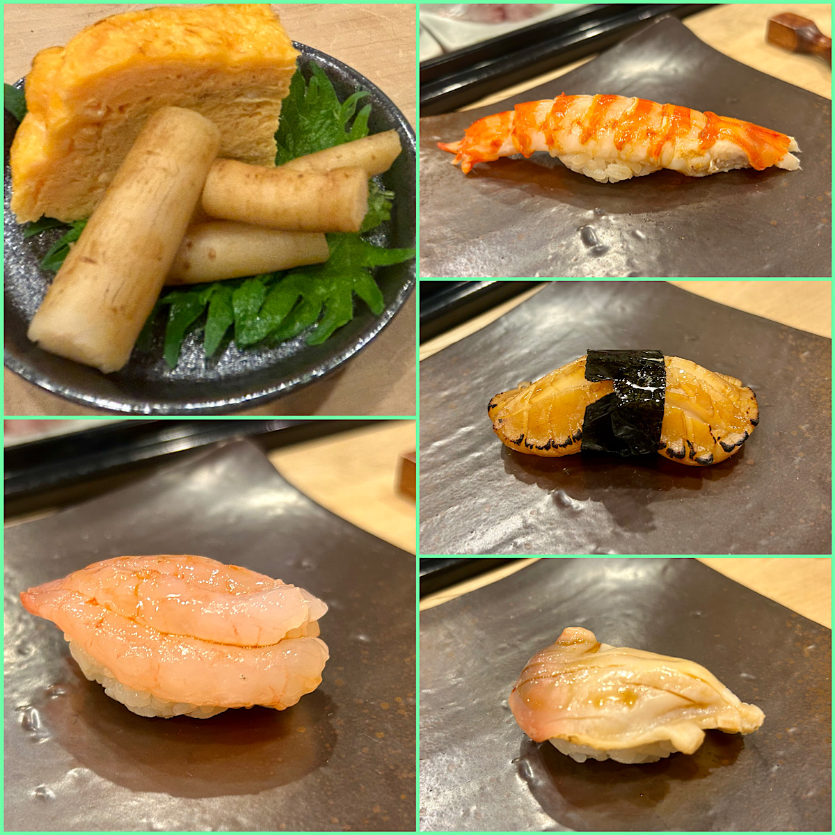 満席だったので寿司が出るあいだに玉子焼きと酢ごぼうでお酒をいただく。おまかせ5貫1000円の盛り合わせがお得なんだけど今回は好きなものだけをいただく。最初に甘エビの昆布締め400円。水分が適度に抜けていて旨みが凝縮。続いて色鮮やかな車海老600円。。帆立貝柱500円は醤油漬けにしてから炙って供される。訪問するたびに、より美味しくなるような新しい仕事に挑戦する姿に敬服する。注文を受けてからさっと火入れする北海道産の北寄貝400円は甘み炸裂。