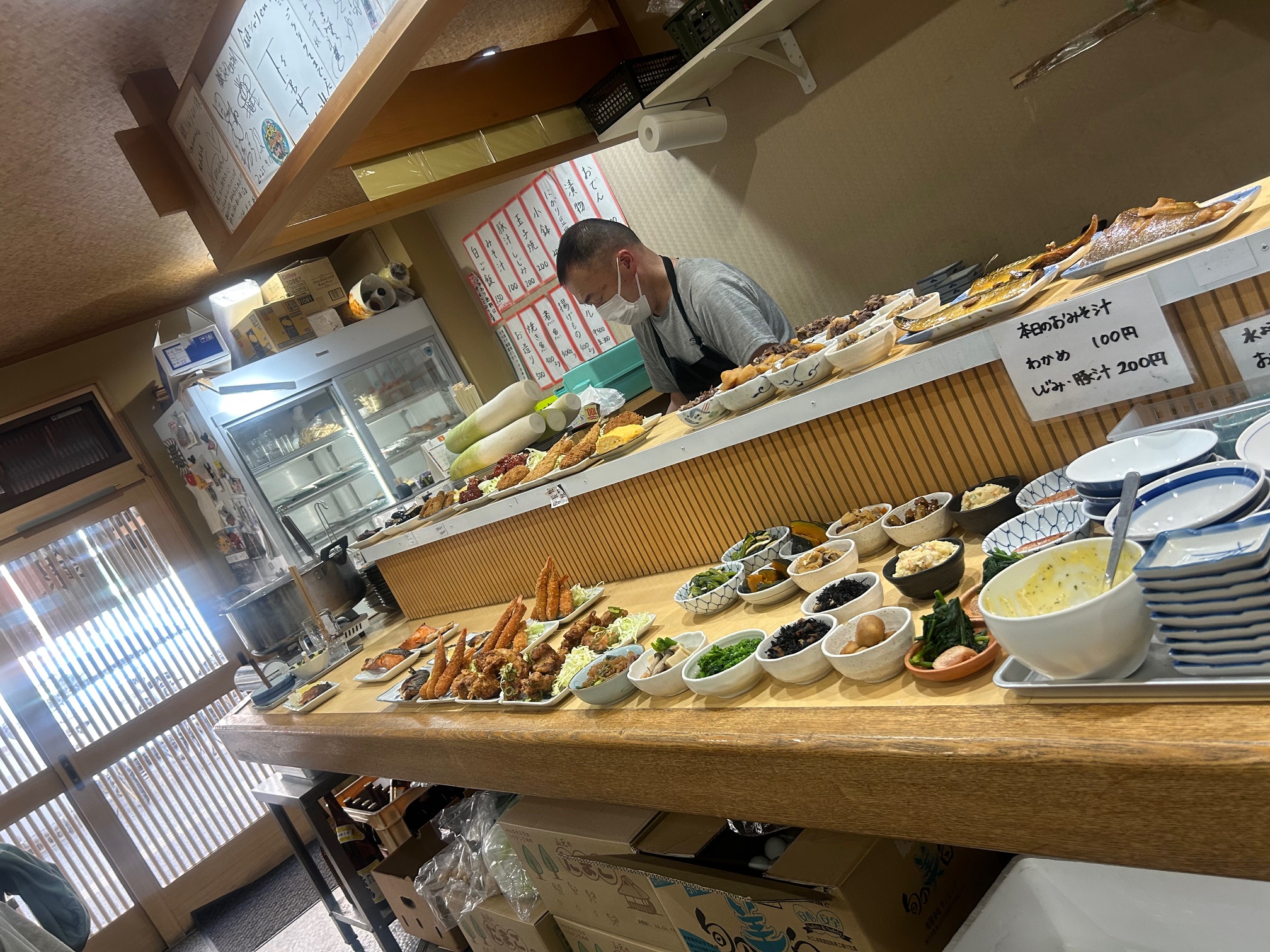 9時半に扉を開けるとすでに客だらけ状態。入り口付近にたくさんの出来立てのおかずが並べられていて2013年以前のゲコ亭の空気感をみごとに再現されておられる。