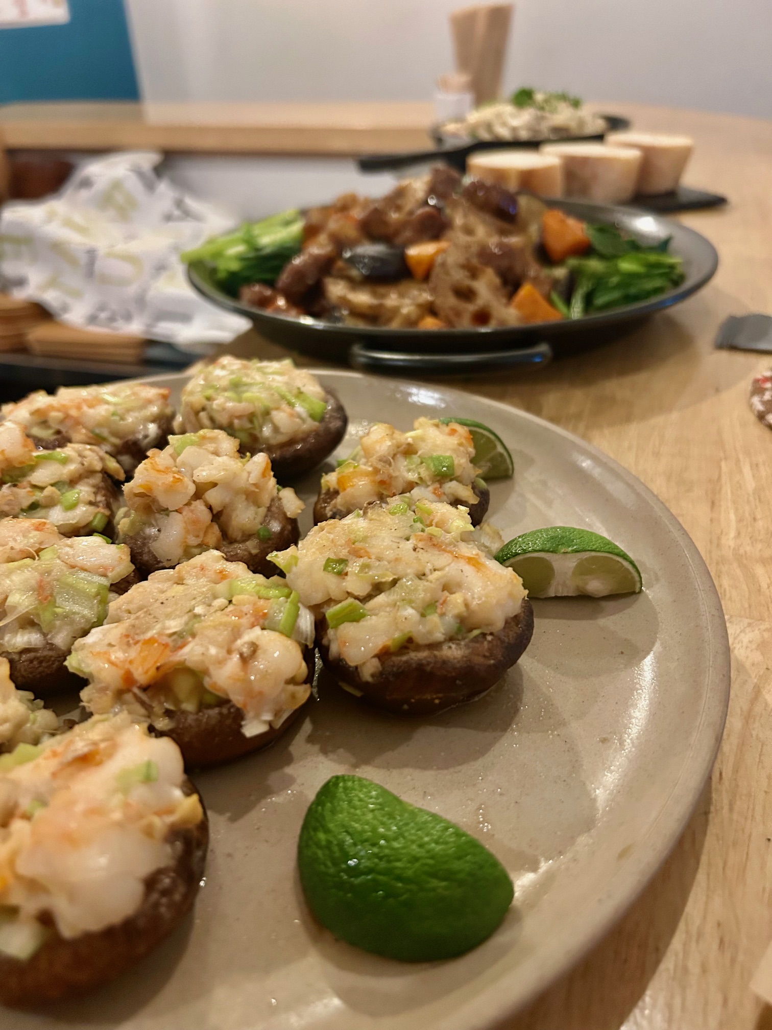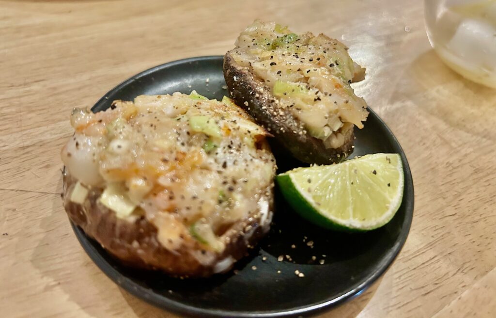 海老を潰したものを椎茸に詰めて焼いたもの。塩胡椒と酢橘でいただく。