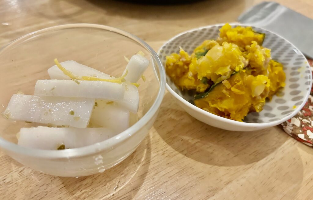 最初にかぼちゃとさつまいもを粗く潰して調味したものと大根の柚子和えを注文。少しずつつまみながら四方山な話とビールを楽しむ。