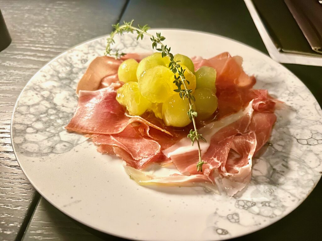 生ハムとマスカルポーネと季節のフルーツ1300円はメロンの下にチーズが潜んでいて一緒にいただくとかなり美味しい。