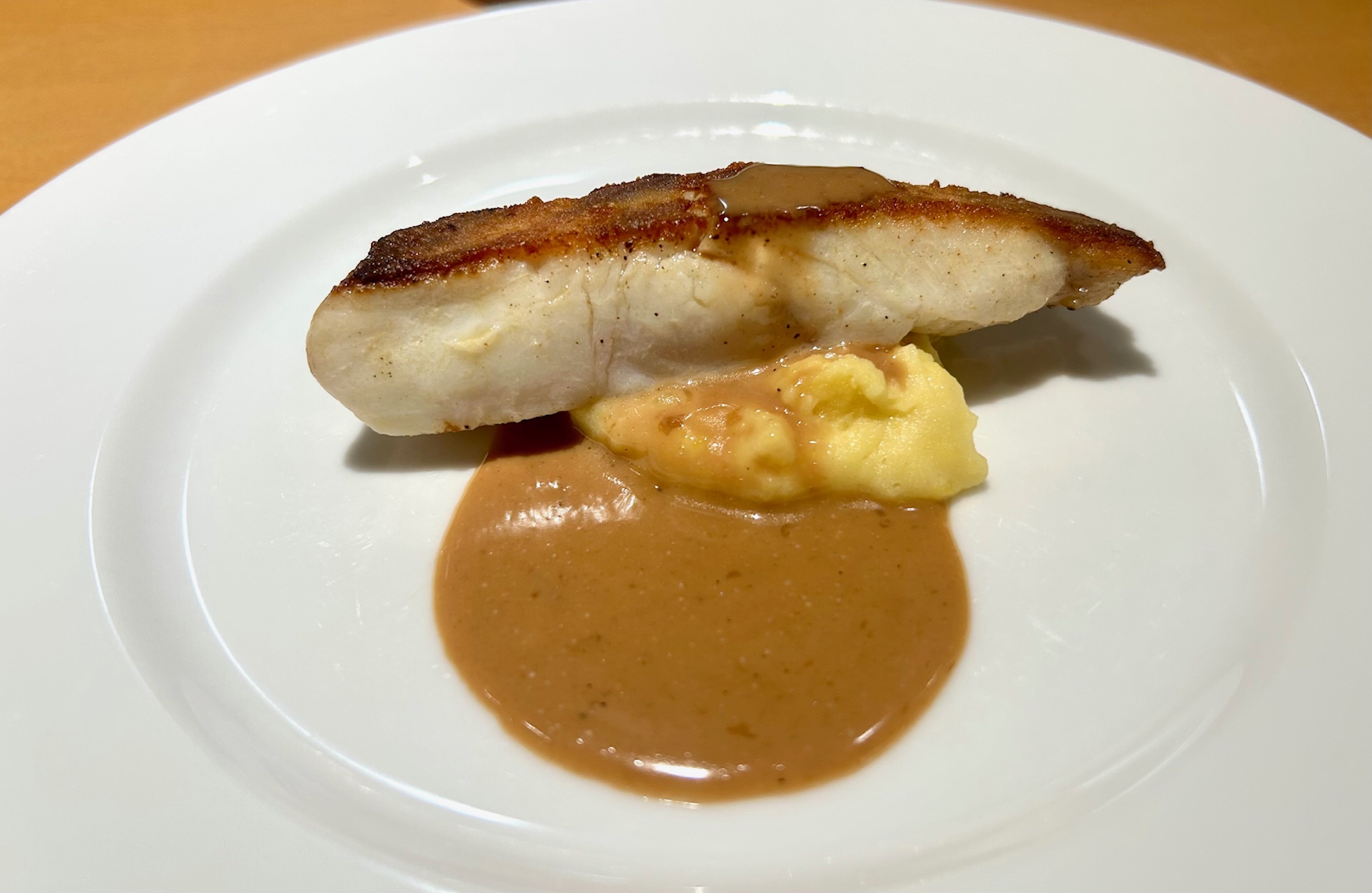 魚料理は平目のアメリケーヌソース。皮目をパリッと焼き上げた身厚の平目と濃厚なアメリケーヌソースの相性は抜群。白ワインが進みまくる。添えられたパンでソースを残さず拭っていただいた。こちらもコートドールのスペシャリティ。