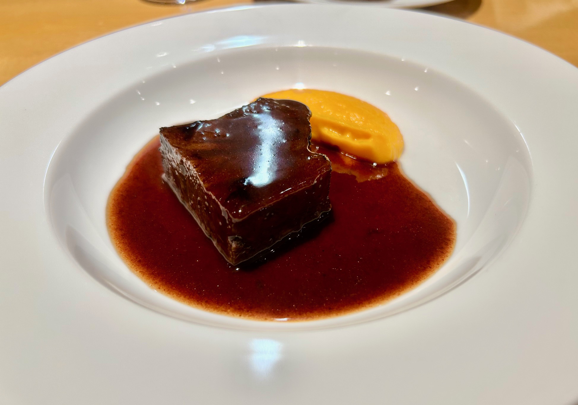 牛頬肉の赤ワイン煮込みもどこにでもある料理。分厚くカットした頬肉を赤ワインで長時間煮込んだものだけどどこよりも美味しいと毎回確信する。重層的に味が入り込んだ肉は繊維が解けるくらい柔らかい。ソースは軽いけど深みがあってずっと食べ続けたくなる。後から香りが追いかけてくる甘いニンジンのピューレの取り合わせもお見事。パンをお代わりしてソースまですべていただいた。