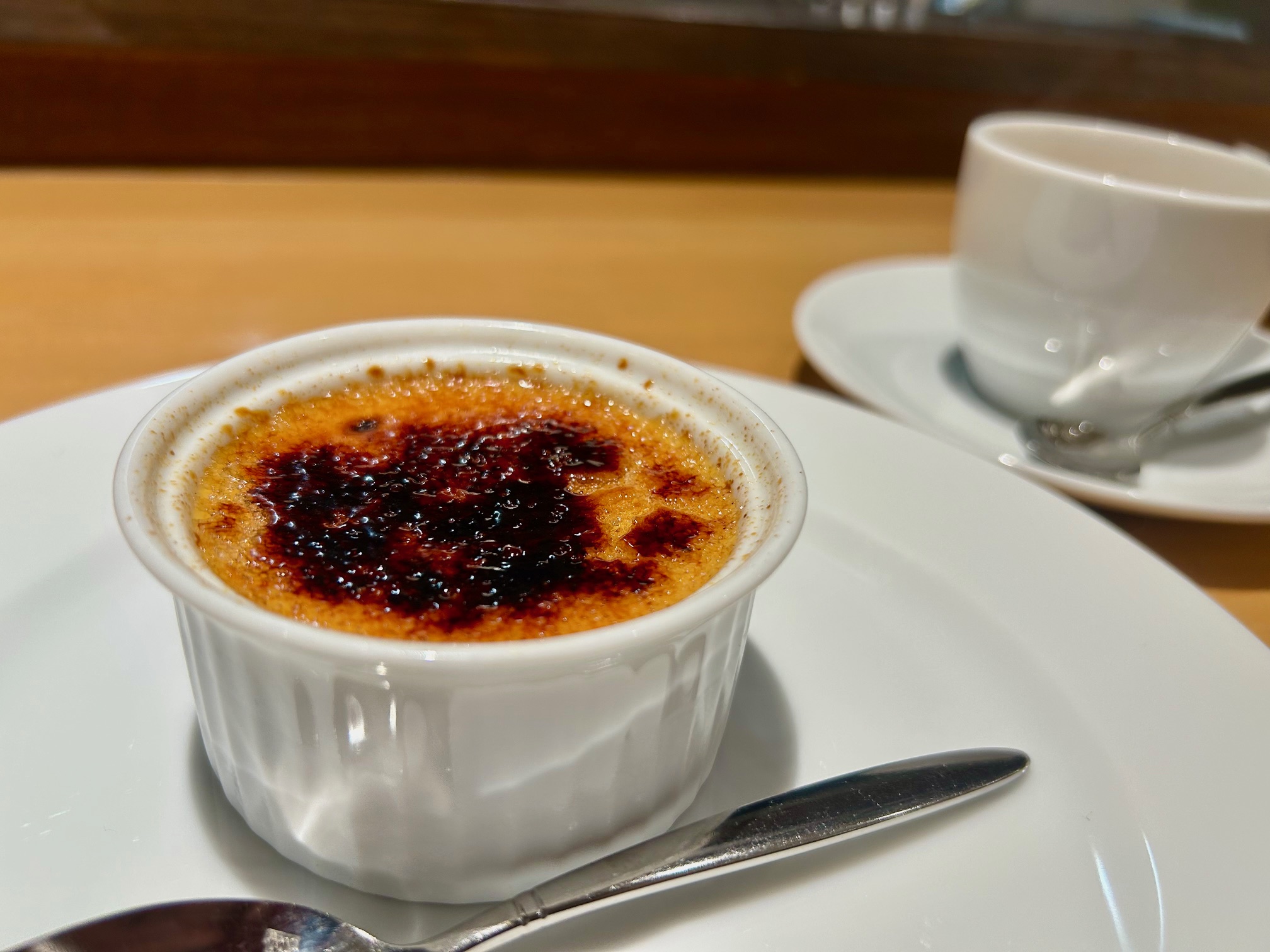 オーソドックスなクレームブリュレ。大量の生バニラビーンズを使った香り高く濃厚な仕上がり。デザートは他にアーモンドのブランマンジェキャラメルソース、チョコレートテリーヌとバニラアイス、バスティスのソルベとアイスクリームなど。