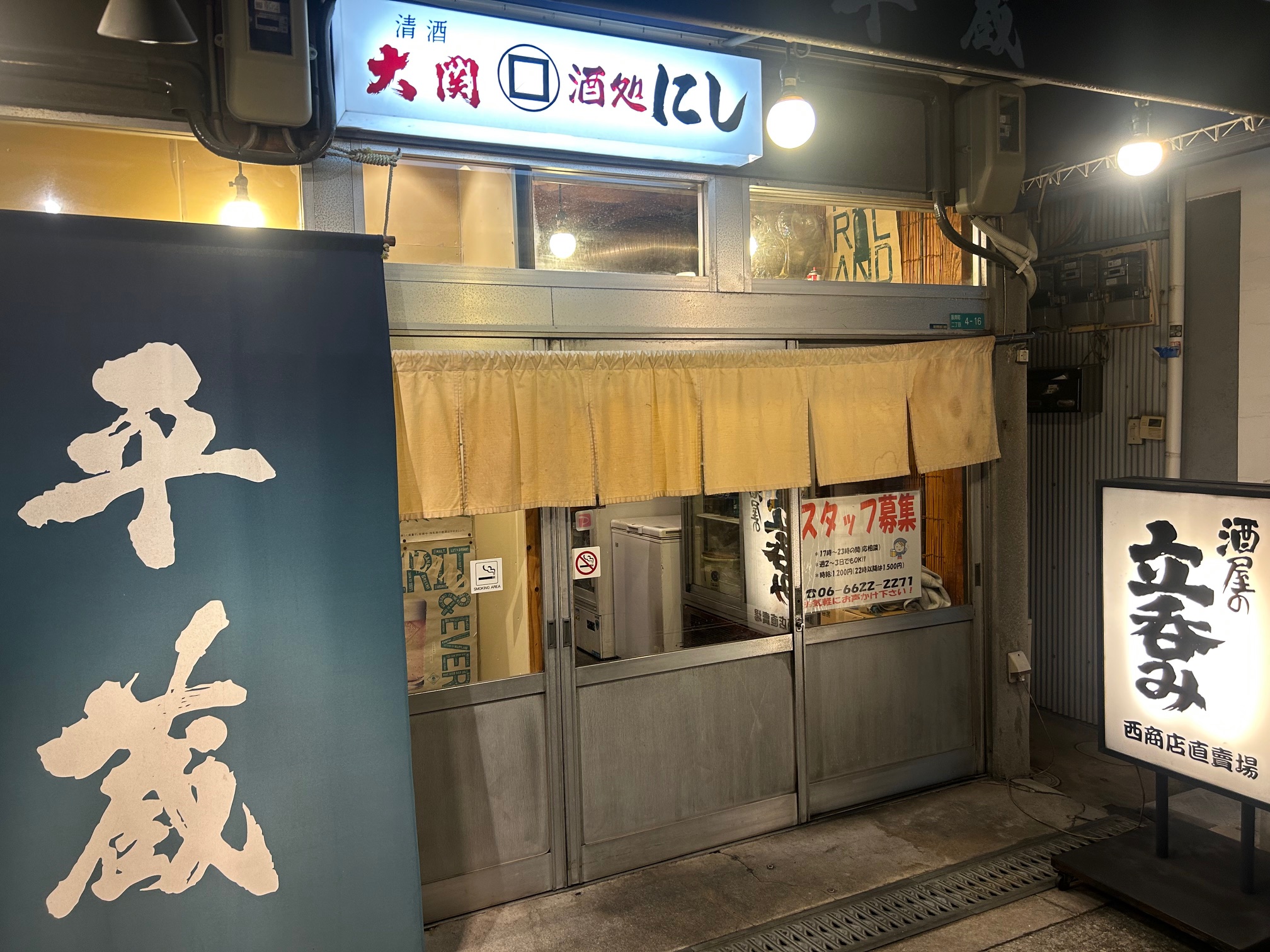 昭和町の表記の立ち飲み店を訪問。大阪メトロ御堂筋線の昭和町駅4番出口から南西方向に徒歩2分。西商店という酒屋さんの直営店。お店は女将さん含め女性2名で切り盛り。手前が立呑スペースで奥はテーブル席になっていてかなり広い。客は常連率高し。