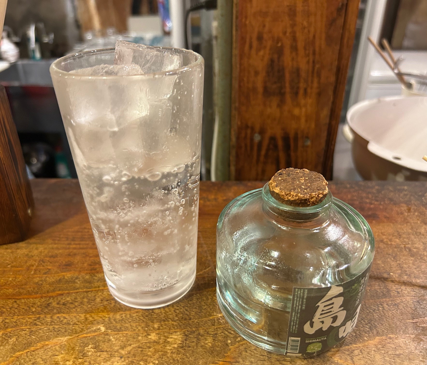 焼酎は入口にある小ぶりの瓶をとって自分で割るシステム。壁に焼酎系6種の銘柄ポスターが貼ってあり黒麹・麦焼酎・紫蘇鍛高譚・泡盛島唄・黒糖レント・球磨焼酎大石などがある。どれも360円でお得感満載。