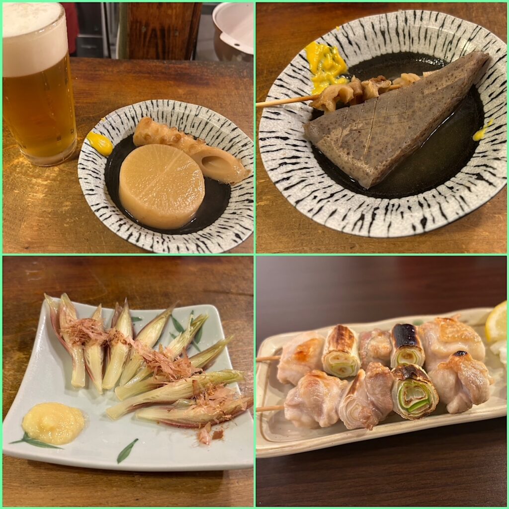目の前のおでん鍋からいろいろ注文。出汁がしっかりと効いていてかなり美味しい。丁寧に作っておられることがわかる。茗荷の糠漬けと大きなねぎま焼き鳥をいただいて店を出る。ごちそうさまでした。