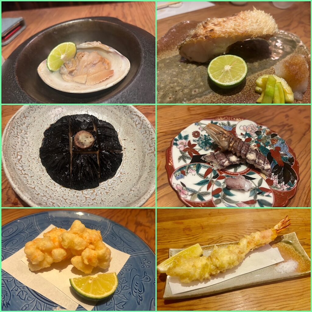 日本酒と共に大きな蛤の塩焼き2000円、巨大ブラウンマッシュルーム焼き1280円、大きな切り身の白甘鯛は鱗焼き4800円、北海道のシャコ2400円は爪肉付き、シラサエビかき揚げ2100円は野菜なしで海老だけを揚げたもの。昼に提供されている大海老の天ぷらは25センチくらいのサイズでびっくり。