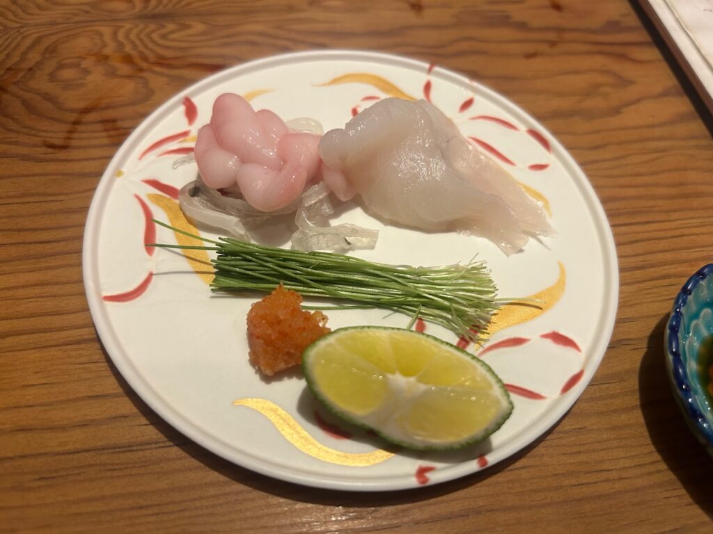 最初に刺身盛り合わせを所望。日本海の天然河豚の厚切りと皮、たらの白子の盛り合わせ。河豚の凝縮された味わいが印象的。