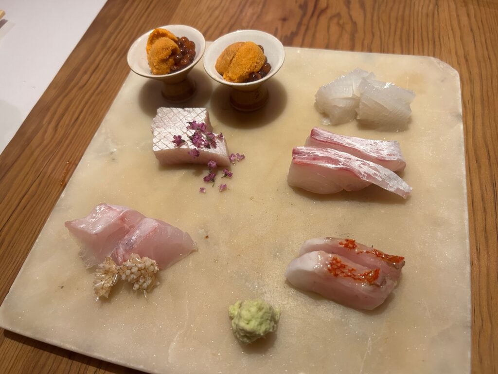 大きな皿に白甘鯛と鱗の素揚げ、天然ぶりの腹部分、皮目を炙ったキンキ、天然鯛、ハリイカ、いくらと雲丹。どれも大きな切りつけで食べ応え満点。ワンランク上のおいしさに感動。