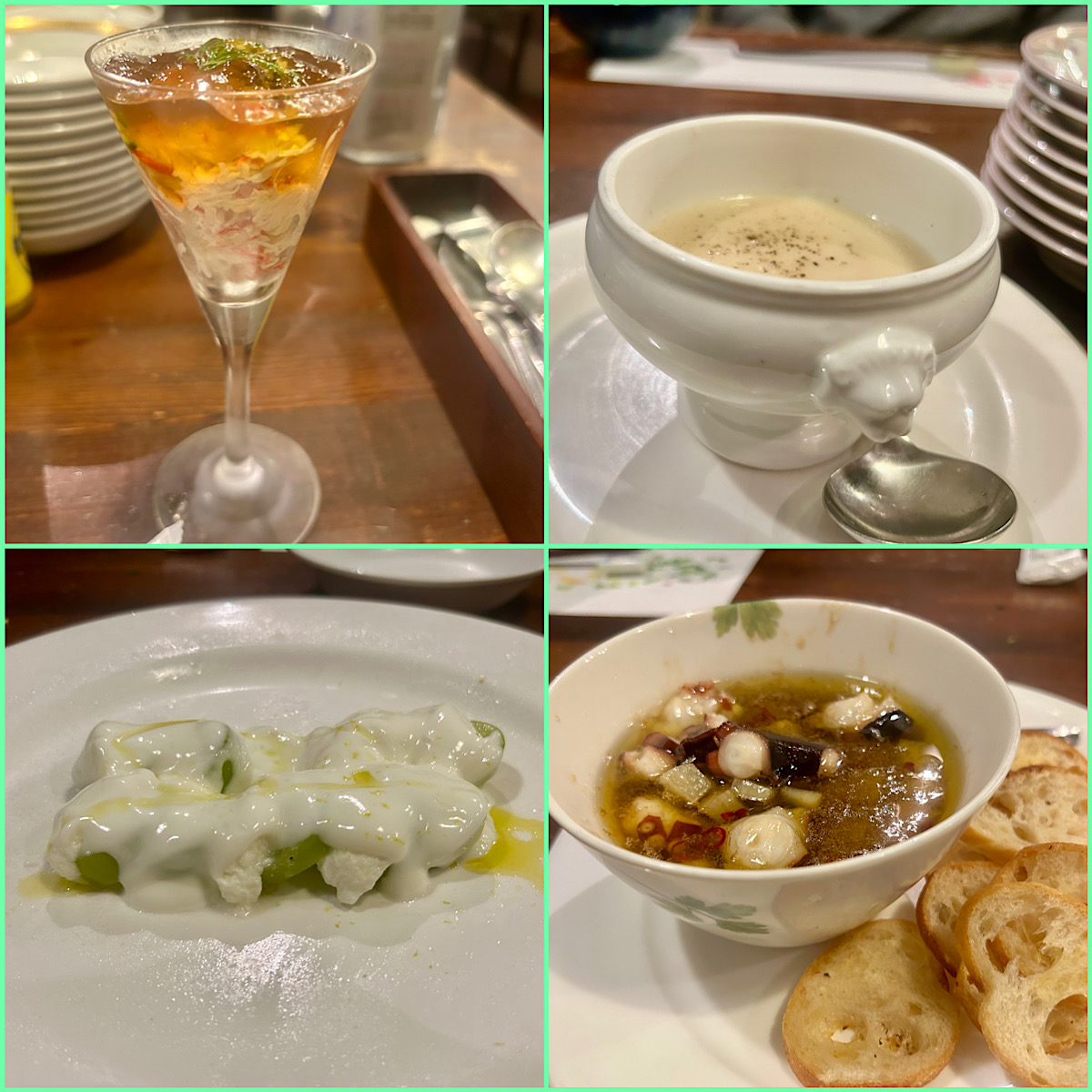 最初にビールと松葉蟹のジュレ1200円をいただく。蟹の身と味噌がたっぷり入ったグラスに酸味の効いたジュレがたっぷりかかる。見た目よりも食べ応えあり。