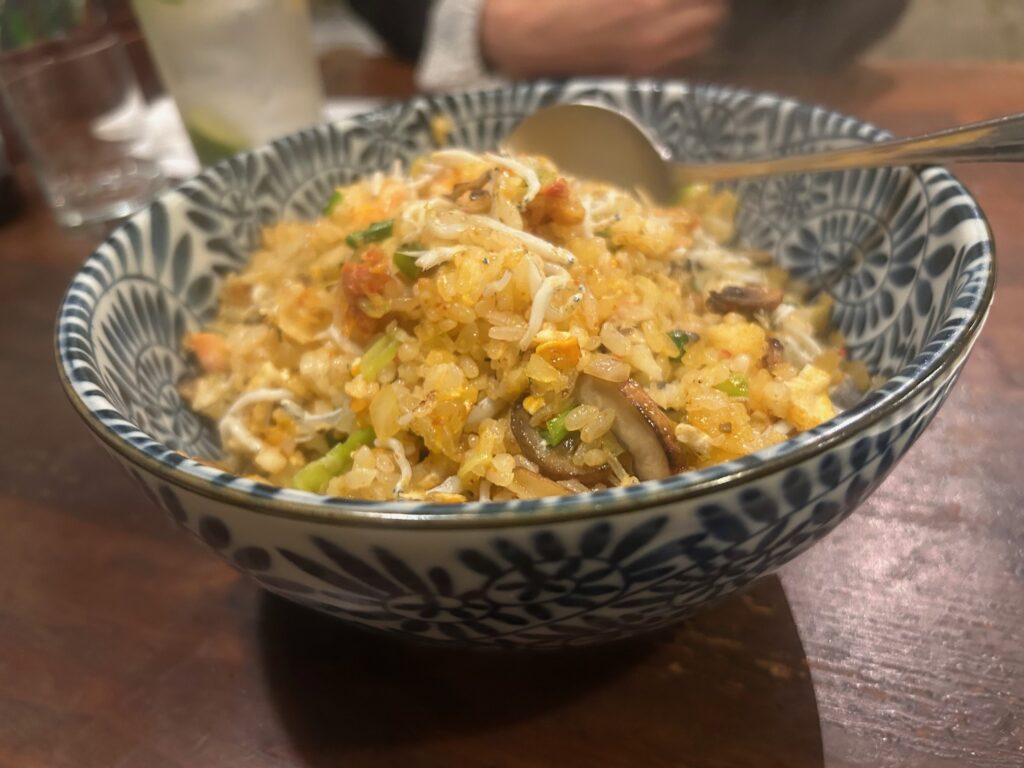 メニューにはない「賄いピラフ」はシラスや蟹の身など全部で35種類の具材が入っているらしい。ドリアやパスタ、リゾットもあるけど店主の一押しらしい。味も個性的でおすすめの逸品。