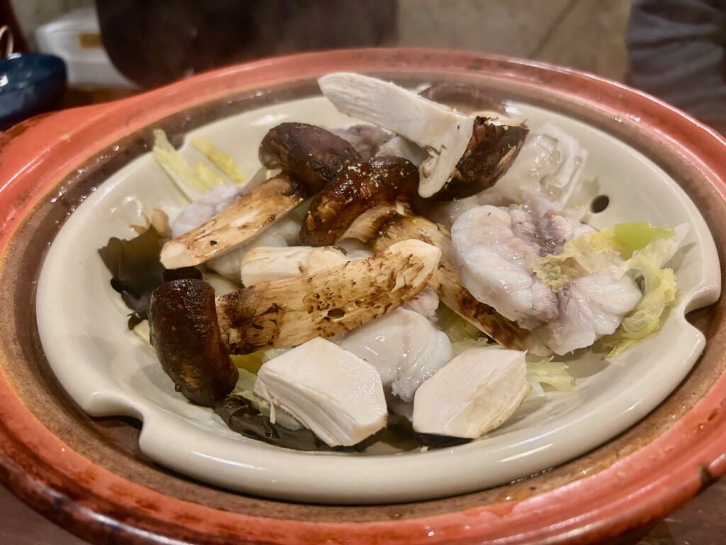 この日のメインは天然河豚と松茸の土鍋蒸し。自家製のまろやかなポン酢でいただく。仕入れてから3日間熟成させた河豚は3キロオーバーのものでこの大きさしか使わないと言っておられた。