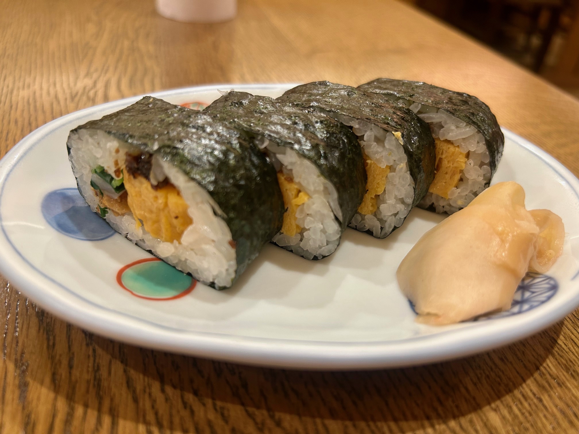 ランチタイムは名物の巻き寿司ハーフサイズが提供される。穴子や干瓢なども入り、海苔も有明の特上のものを使用されている。界隈の高級寿司店の店主が土産に買って帰るレベル。