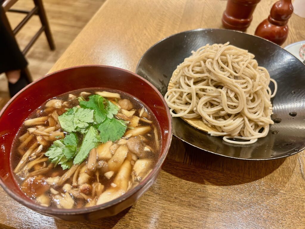 しばらくして蕎麦が着皿。こちらの蕎麦はしっかりとしたコシのあるタイプ。喉越しも良くて香り高い。総じて非の打ちどころのない品質の高さに毎回感心しながらいただく。つけ出汁もキノコのエキスがしっかりと染み出してとても地味深い。塩分濃度は高くないんだけど旨みがとても強くて蕎麦が一層美味しく感じる。濃いめの蕎麦湯をつけ汁で割って最後までしっかりいただく。ごちそうさまでした。。。
