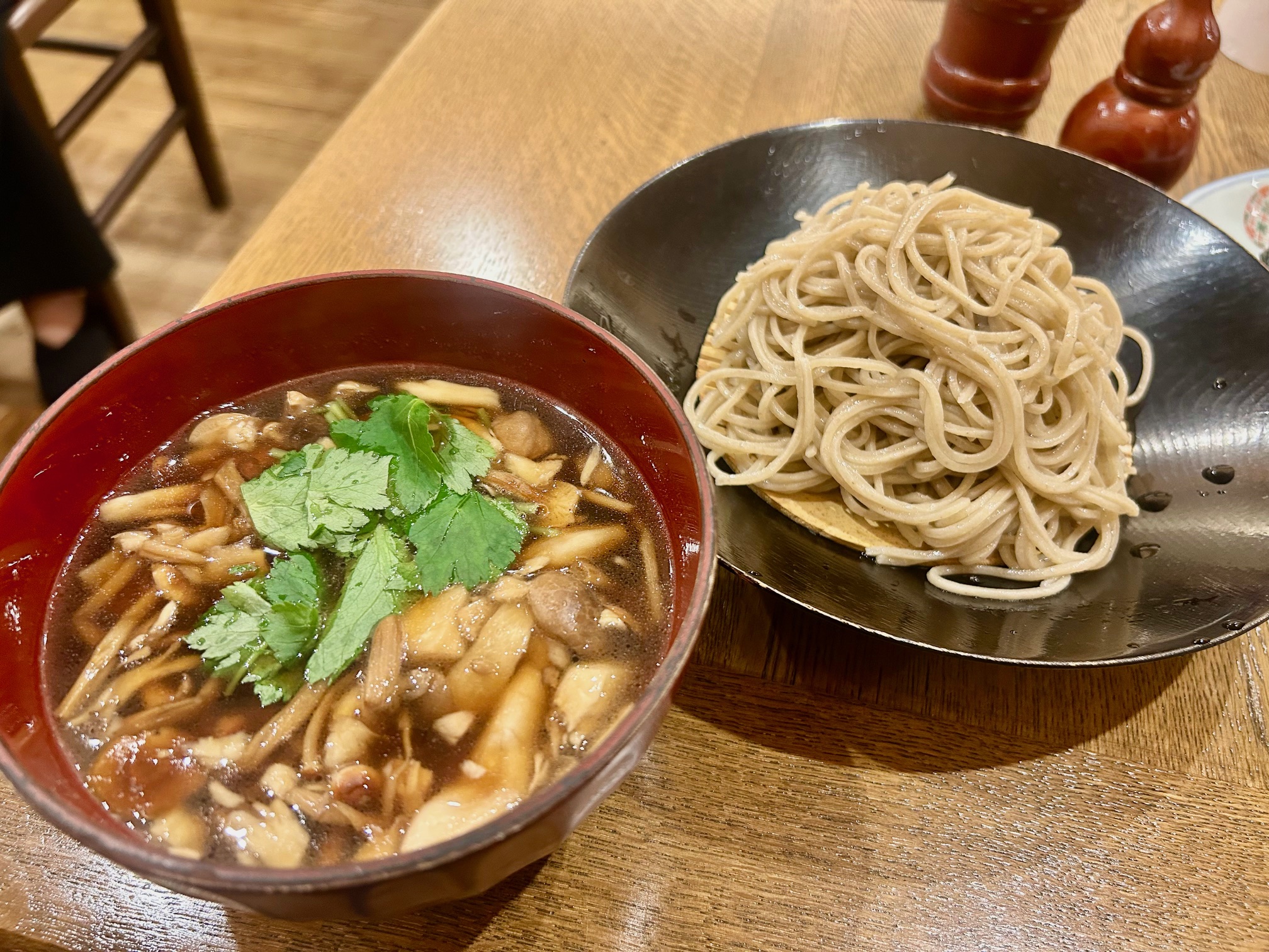 ランチタイムは石臼で挽いて手打ちする十割蕎麦や二八蕎麦を提供。冷たい蕎麦と温かい蕎麦のみならずその時期に合わせた季節の蕎麦も提供される。今回は秋限定のきのこのつけ蕎麦2200円を注文する。隣の女性客は胡桃そばを食べていた。